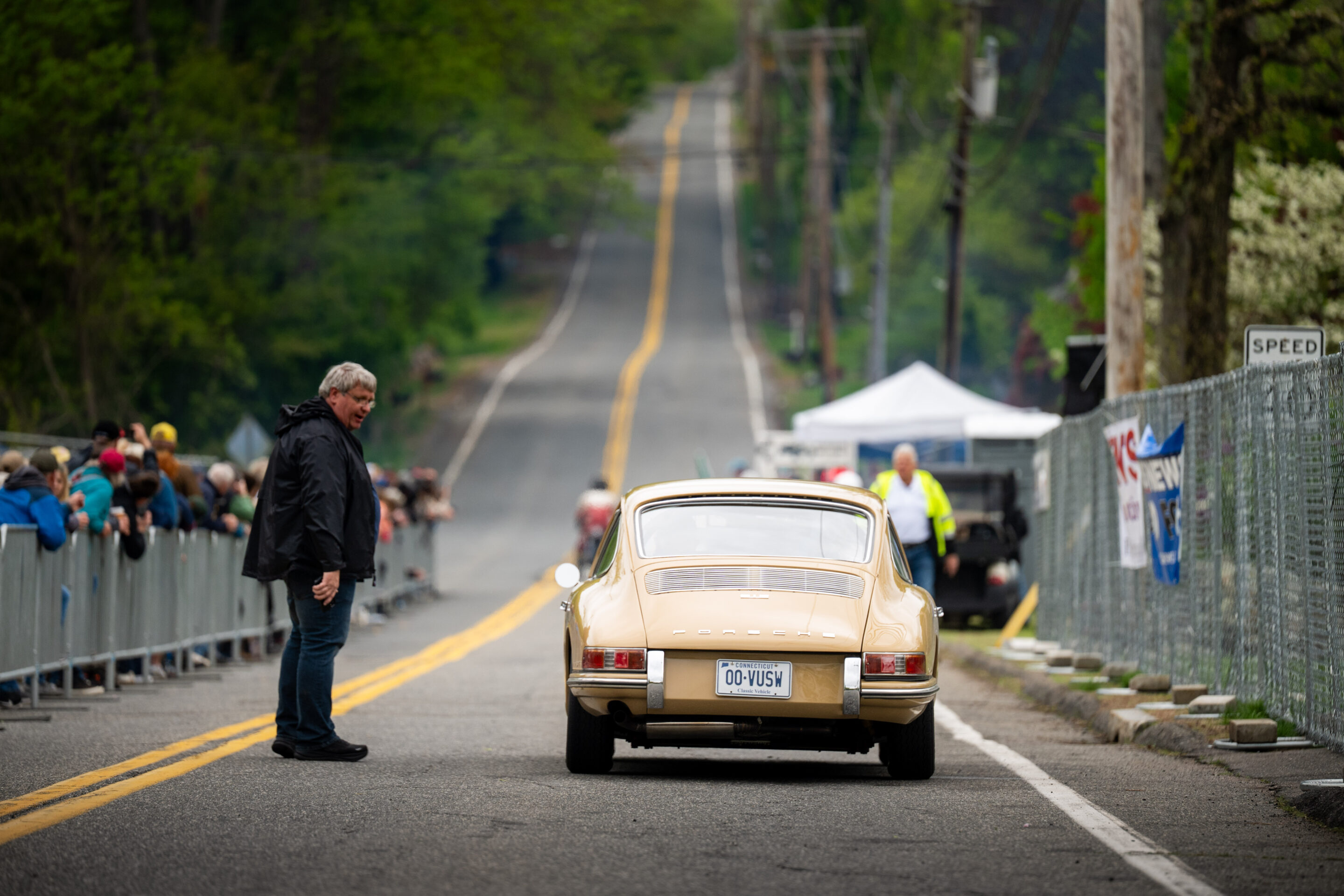 A classic Porsche faces Monson Road prior to starting a timed run during the Wilbraham Hill Climb on Saturday, May 10.