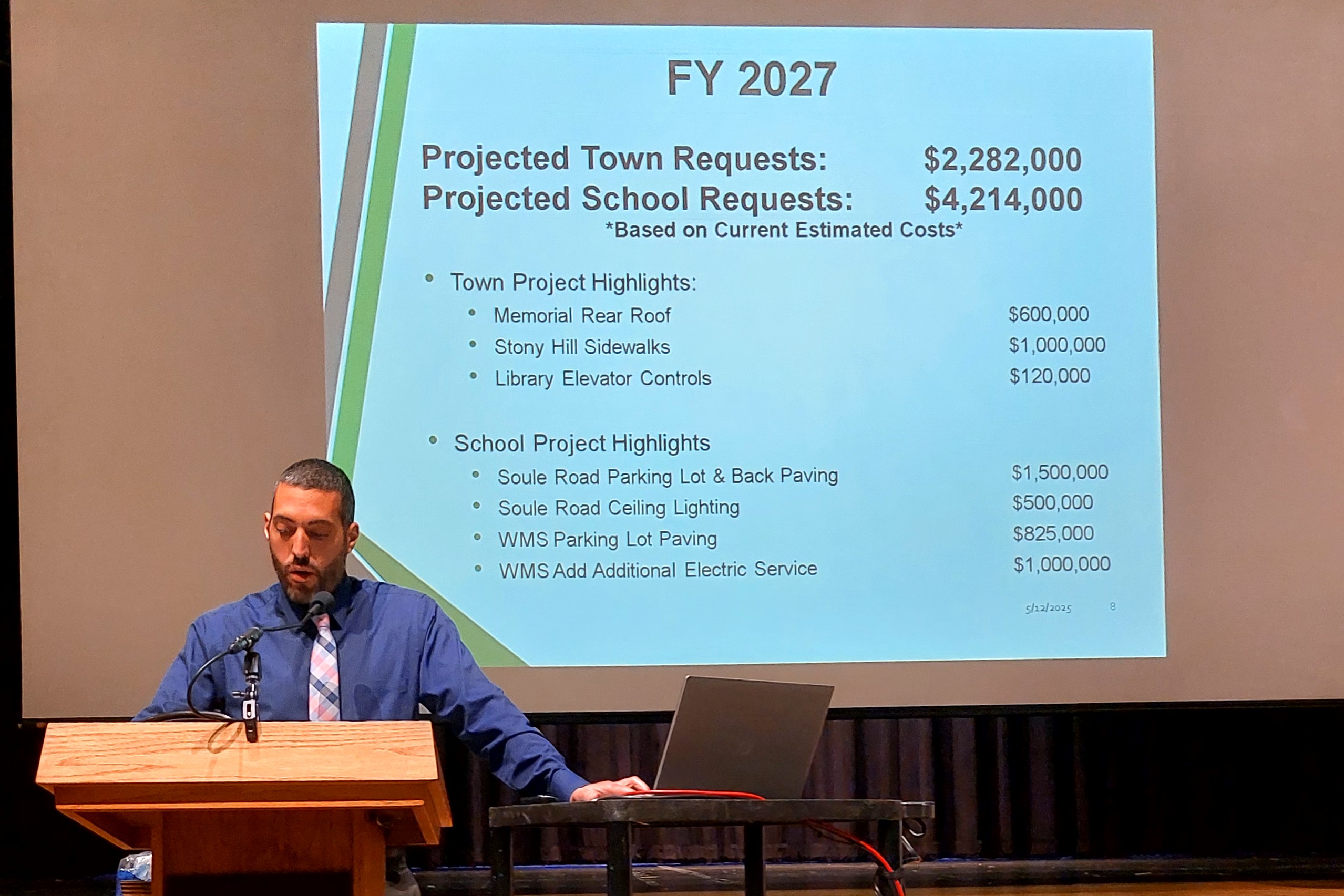 Capital Planning Committee Chair Nicholas Manolakis presents capital projects to voters at Town Meeting.
