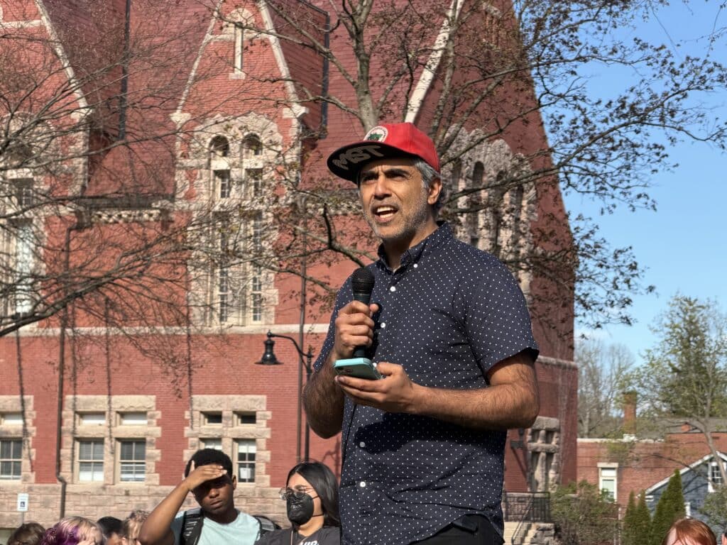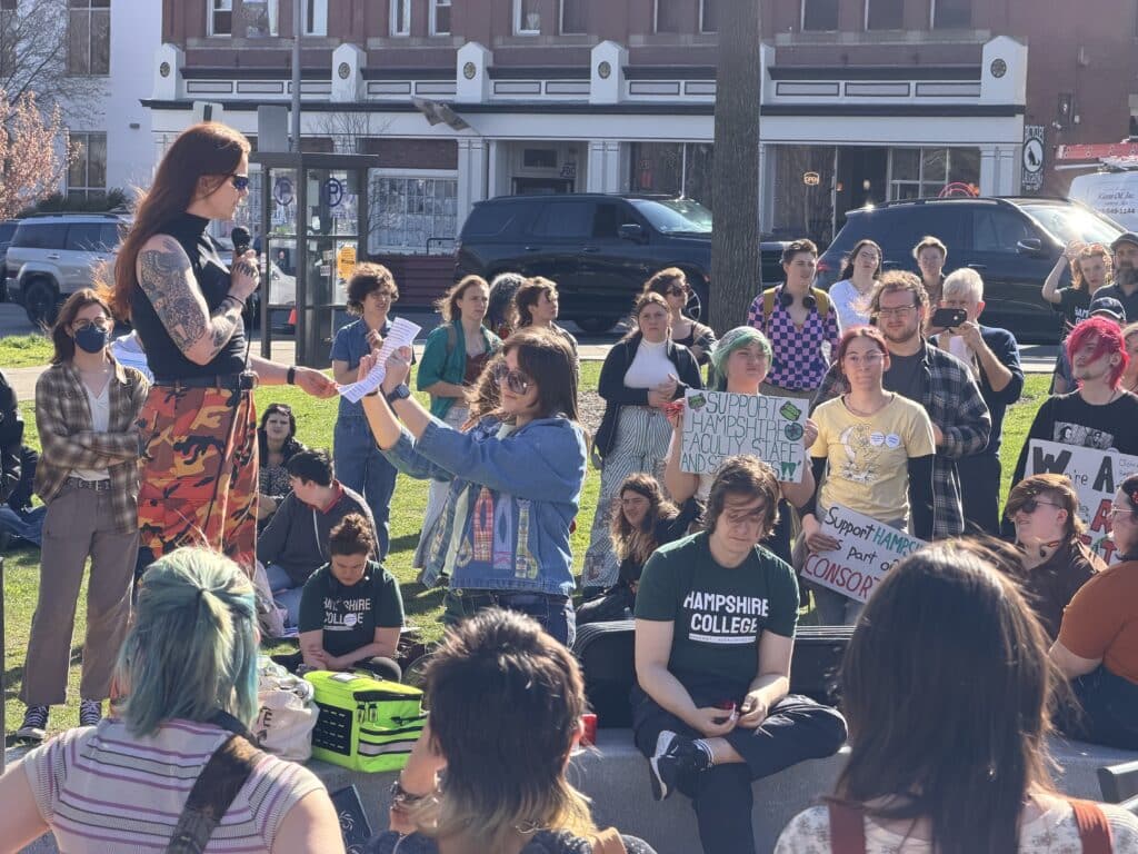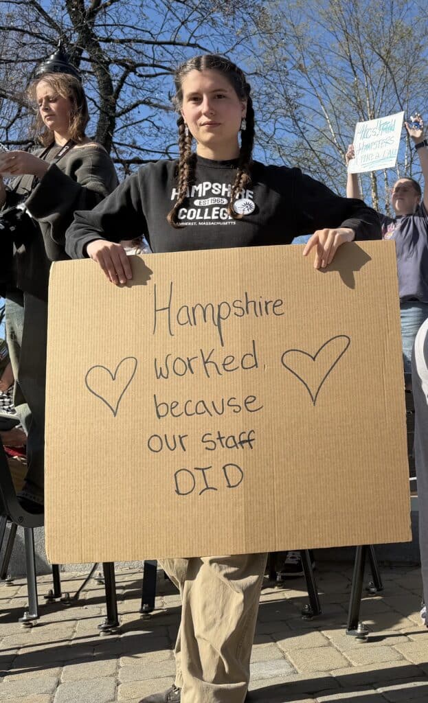 “We deserve a just closure. So many of us are really struggling right now. We’re overwhelmed. We found out as employees just last week, we’re all getting laid off,” said Jashnani. “I know many of you are here because you love Hampshire. You’re grieving, and what I can tell you about me is this: I’m disabled, I’m neurodivergent, I’m a queer person of color, and I fiercely believe in justice. There’s not a lot of places where I could bring even half of my full self to work, but Hampshire has been a place like that for me.”