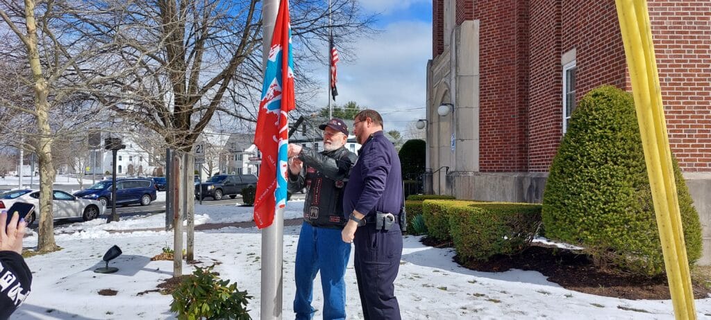 One member of the organization, who identified himself as “Runner,” worked with School Resource Officer Jason Kroll to raise the flag.