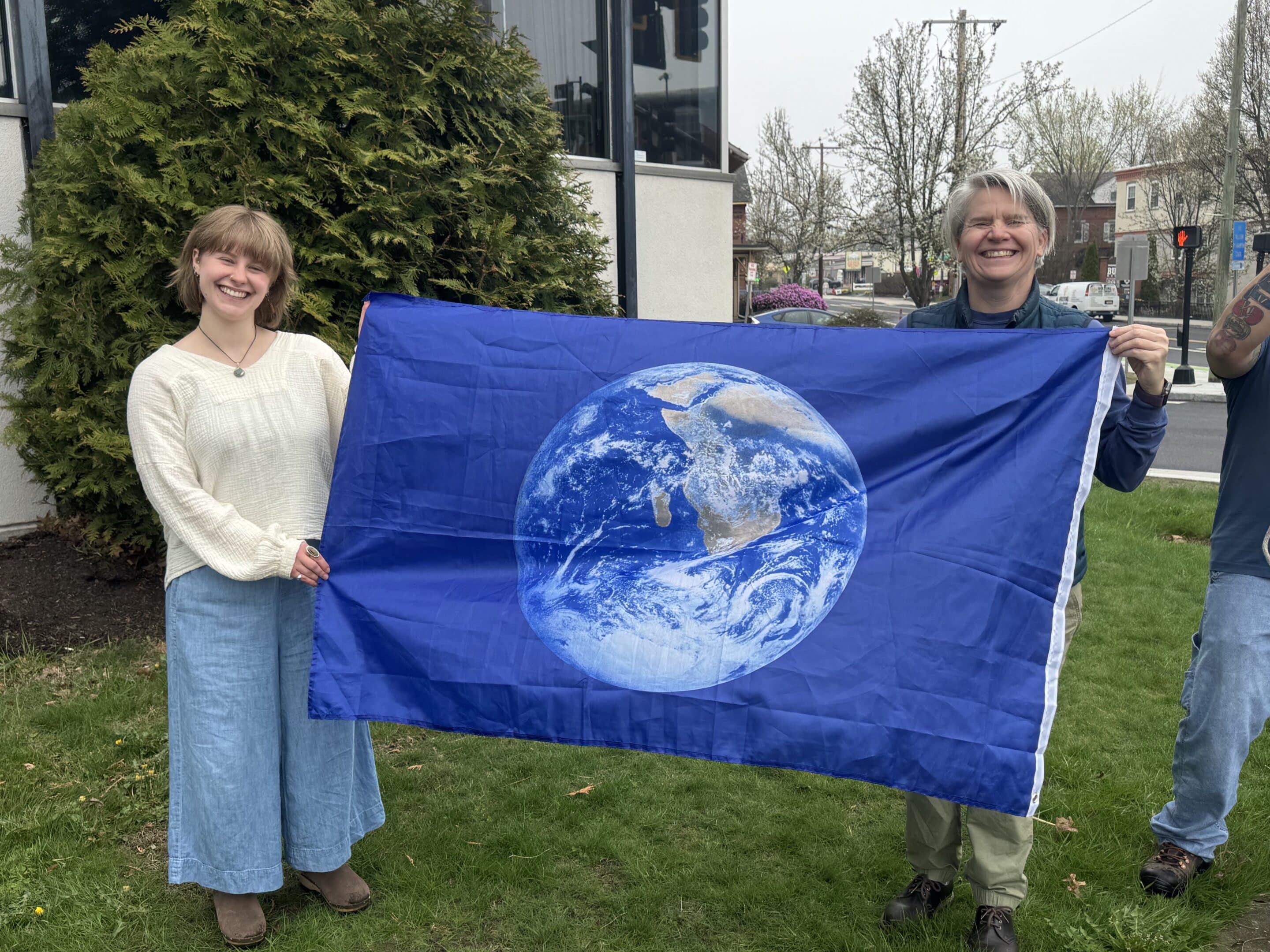 Easthampton Sustainability Coordinator Sophie Protano (left) and City Councilor Koni Denham (right) pose with the flag that was raised to commemorate Earth Day in Easthampton.