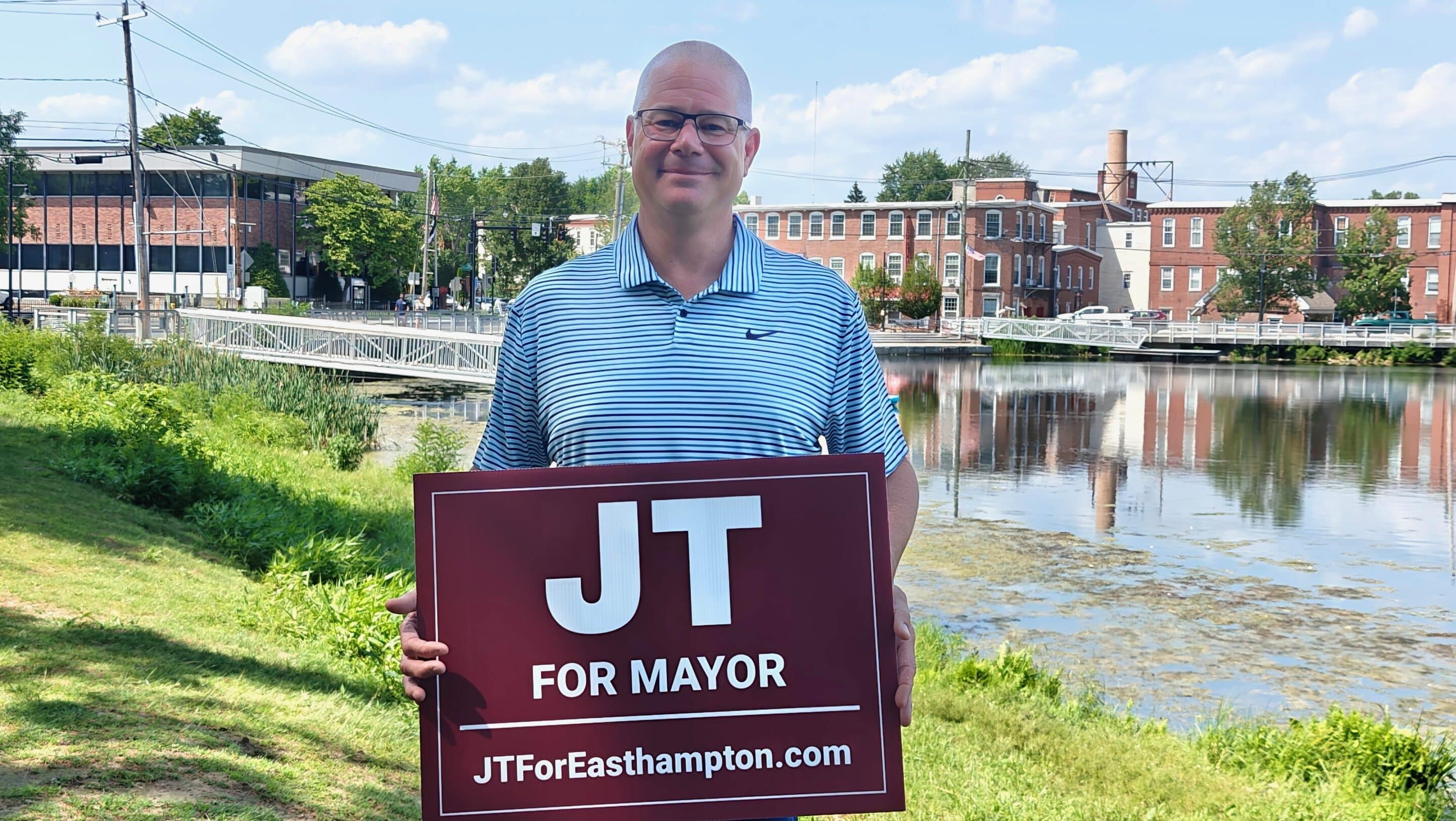 Easthampton City Councilor JT Tirrell poses with his campaign sign at Nashawannuck Pond, the site of the announcement for his bid for mayor back in May. A kickoff party for the campaign was hosted on June 26.