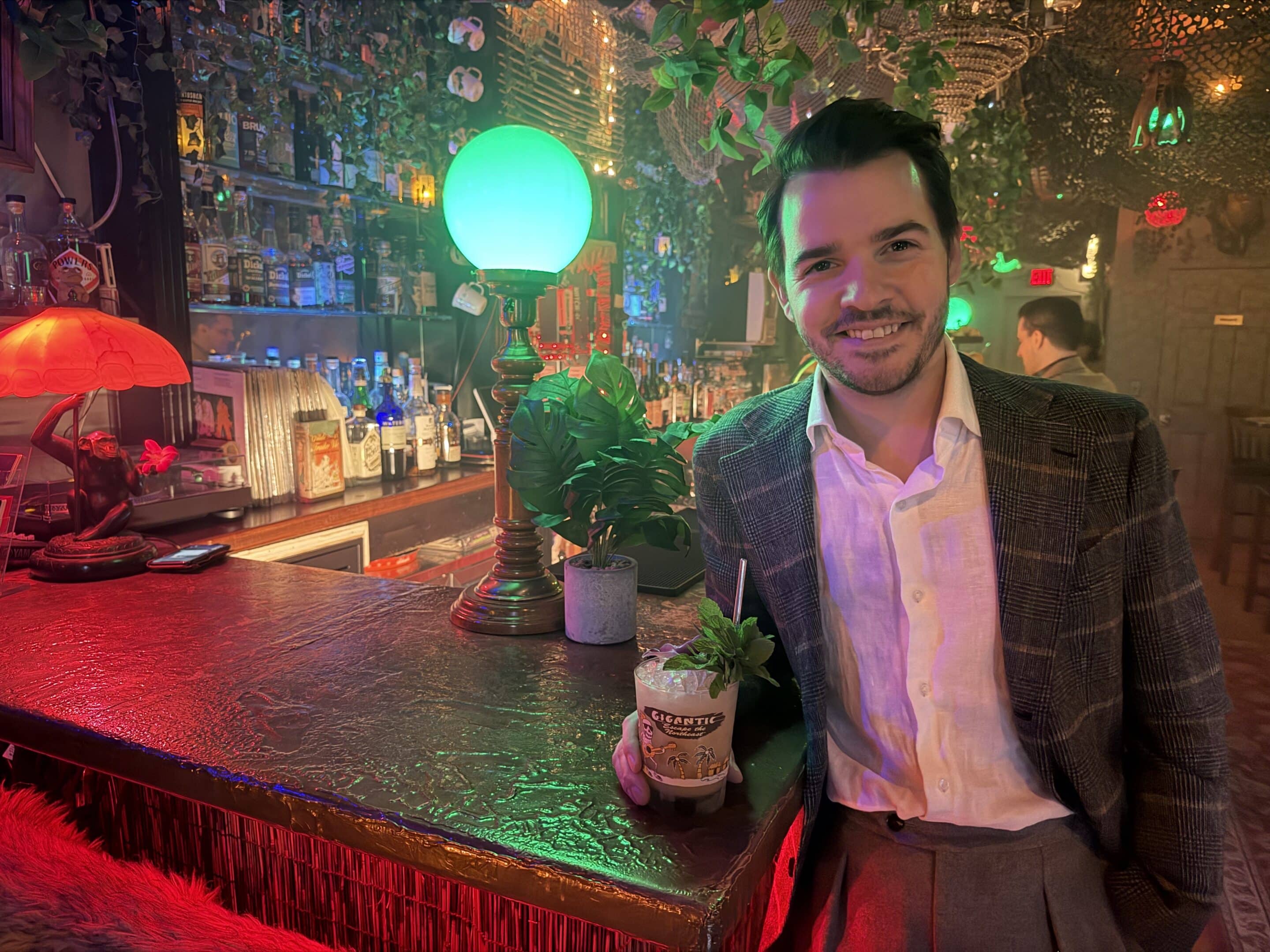 Ned King, one of Gigantic Bar’s founding partners and Bar Manager, poses inside the “Escape the Northeast” makeover given to the bar to provide an escape for the public during the home stretch of the winter months.
