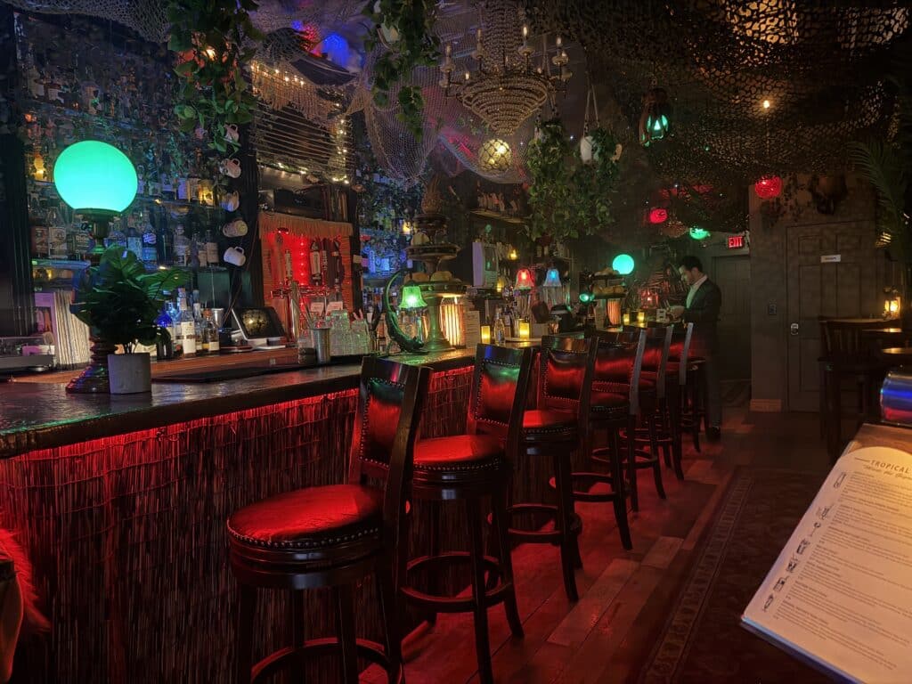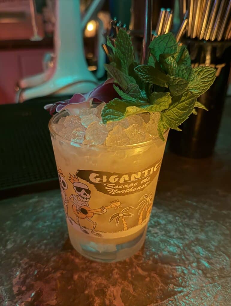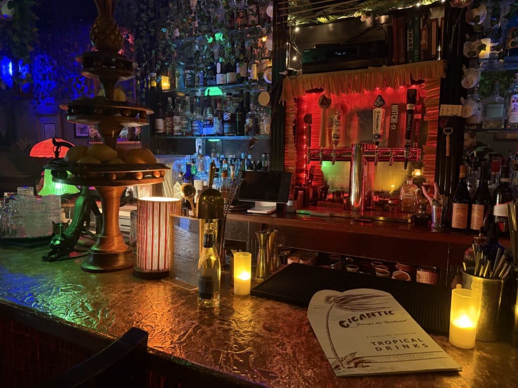 The Escape the Northeast menu includes a variety of tropical drinks that are “Made the Gigantic Way,” from classics to new twists. The menu primarily contains tiki drinks founded between the 1930s and the 1970s, served in special cups to add to the tropical presentation, while the bar itself is covered in tropical decor.
