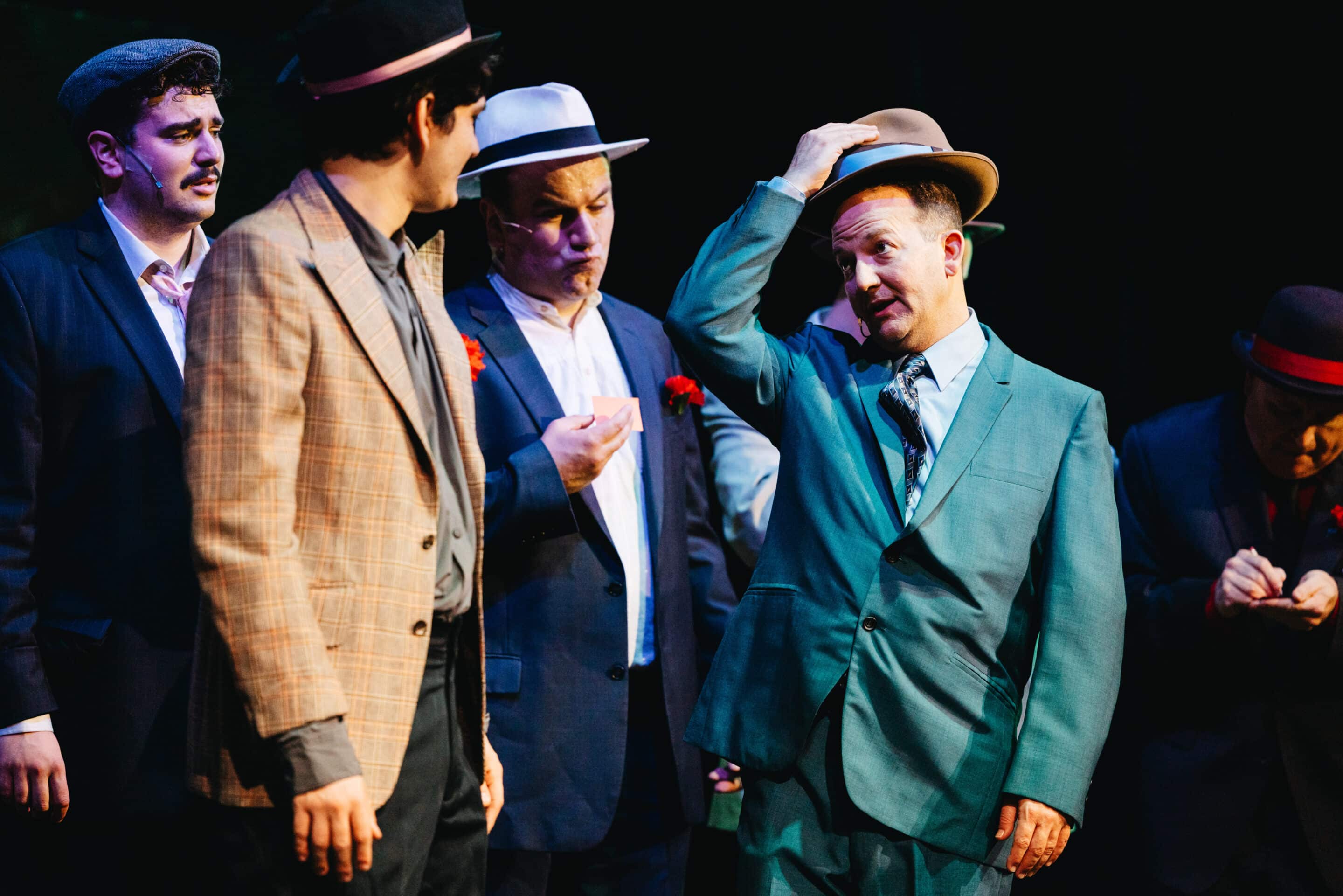 There are two show-within-a-show scenes set at The Hot Box, the club where Adelaide dances, including one that gave rise to the well-known song “A Bushel and a Peck,” featuring Adelaide and the Hot Box girls performing basic steps, choreographed by Director Eva Husson-Stockhammer. Both of these scenes could have used more refinement and energy.