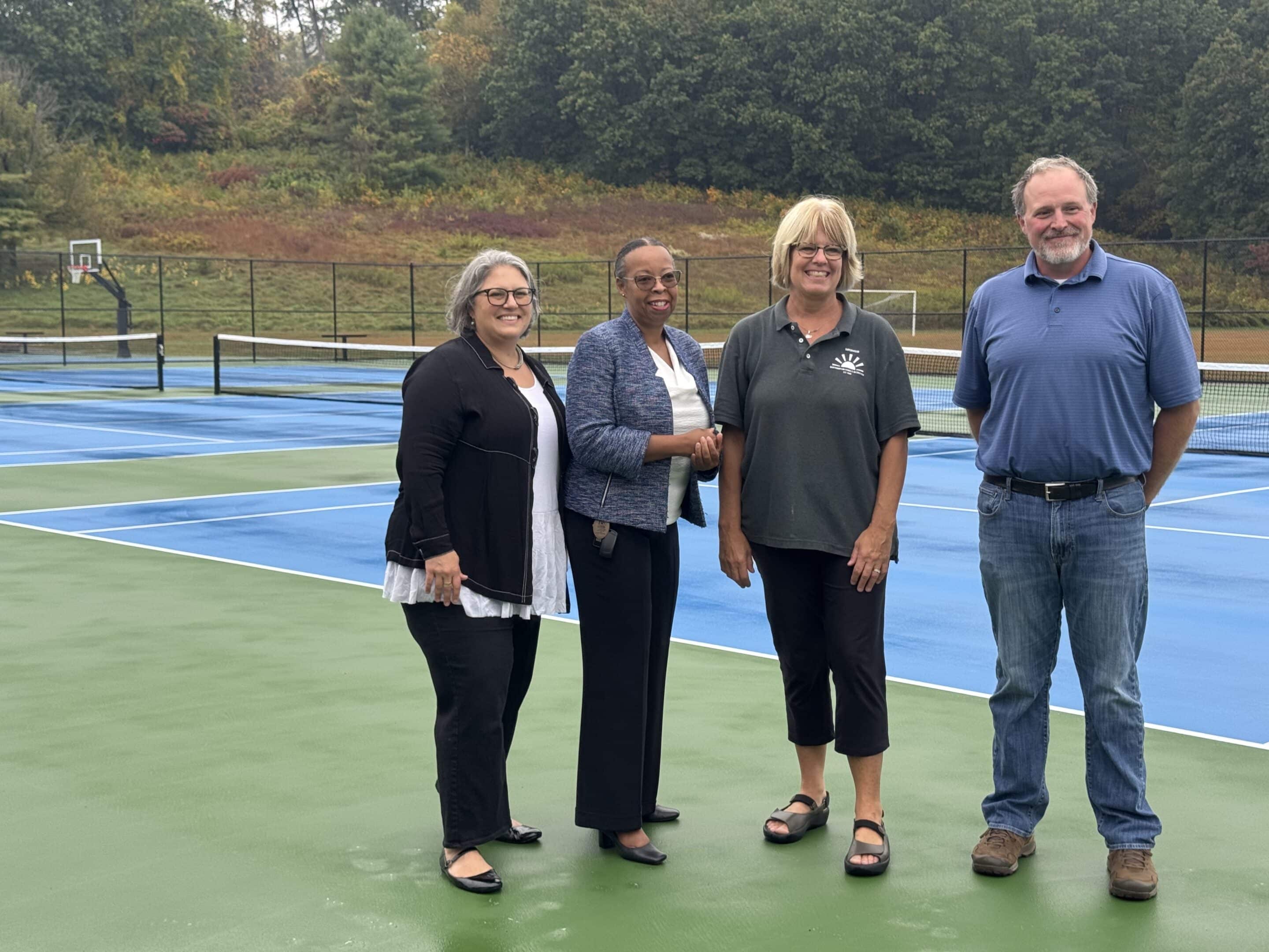 Northampton Mayor Gina-Louise Sciarra, Public Schools Superintendent Portia Bonner, Parks & Recreation Director Ann-Marie Moggio, and School Maintenance Supervisor Tony Kusnierz pose for a photo on the refurbished courts following a ribbon cutting ceremony on Sept. 24.