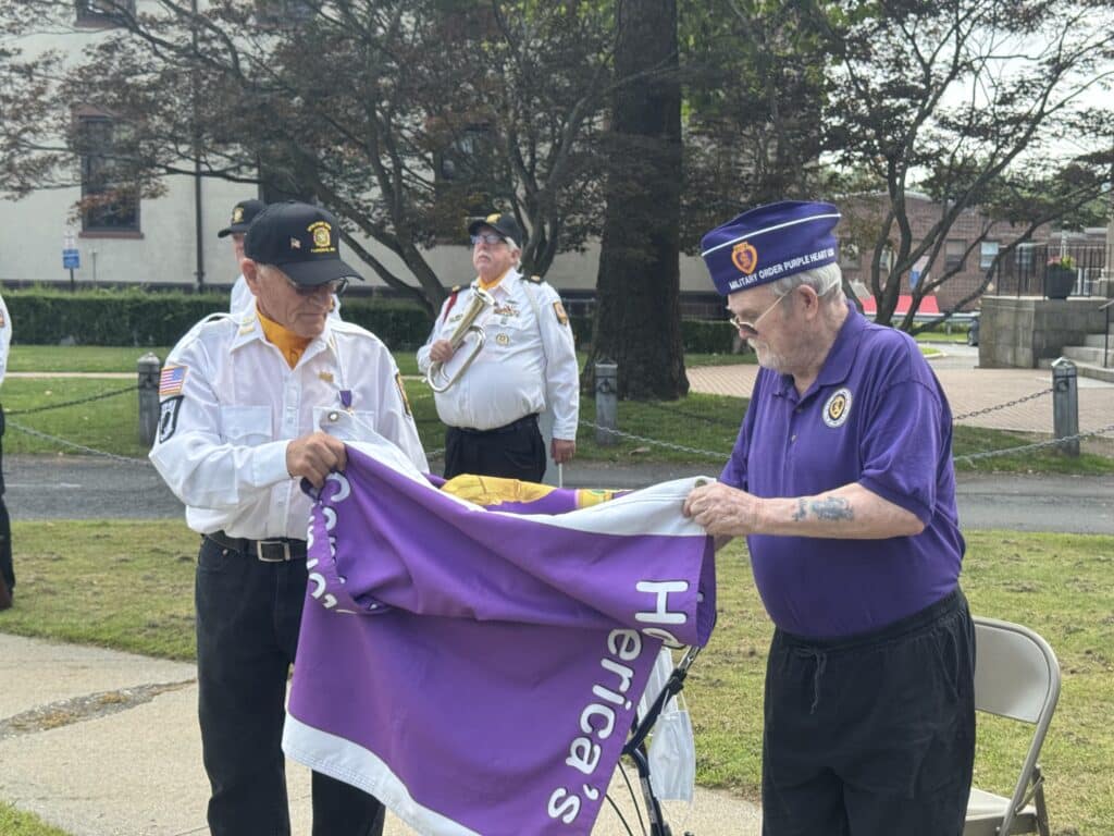 Two local living Purple Heart recipients — Charles Coleman and James Bouchard — were honored during the ceremony and assisted in the raising of the Purple Heart flag outside Memorial Hall. Bouchard was also a member of the Post 8006 Firing Squad on hand for the ceremony.