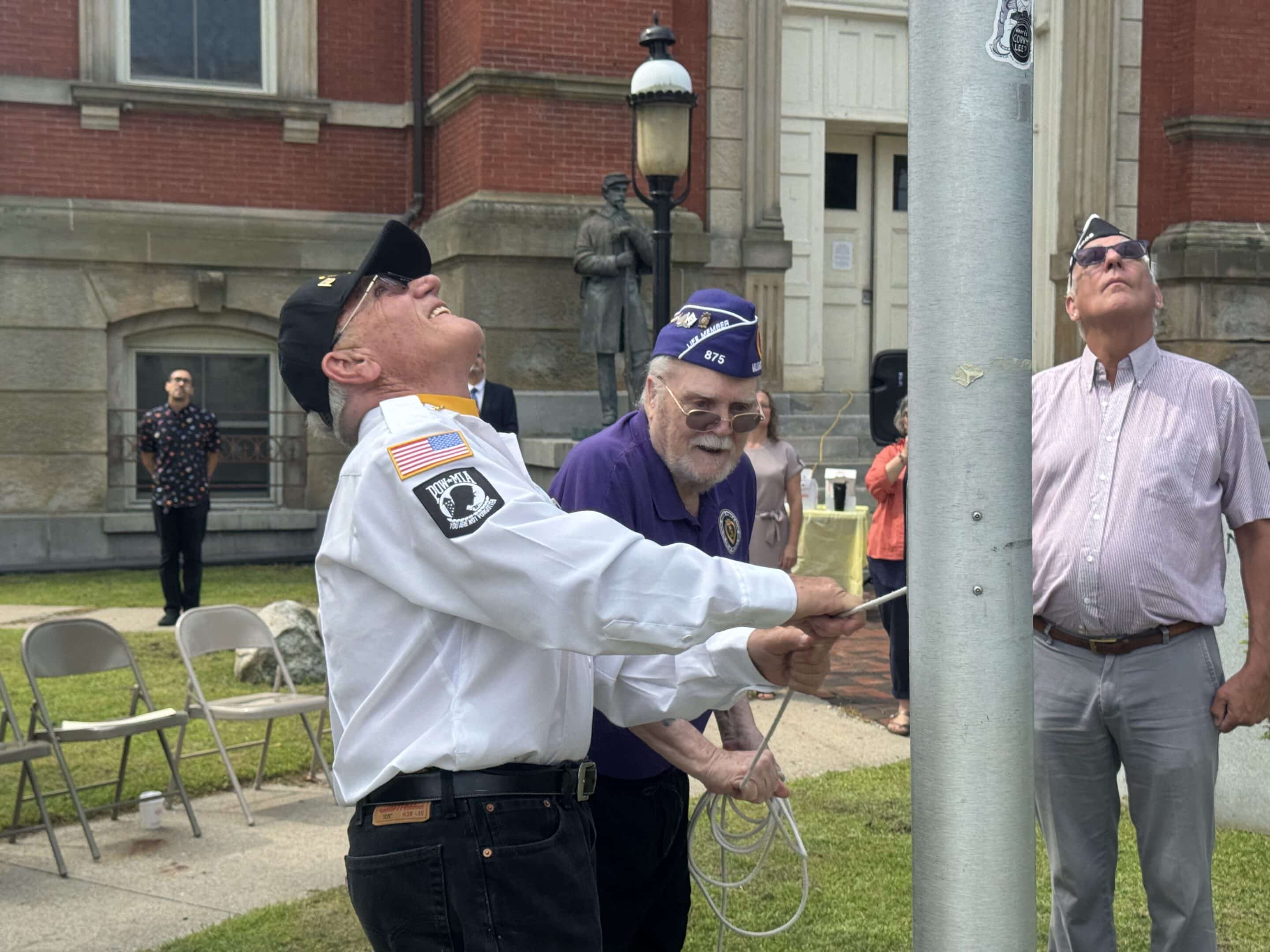 Local Purple Heart recipients James Bouchard (left) and Charles Coleman (right) were honored for their service and participated in the raising of the Purple Heart flag outside of Memorial Hall.