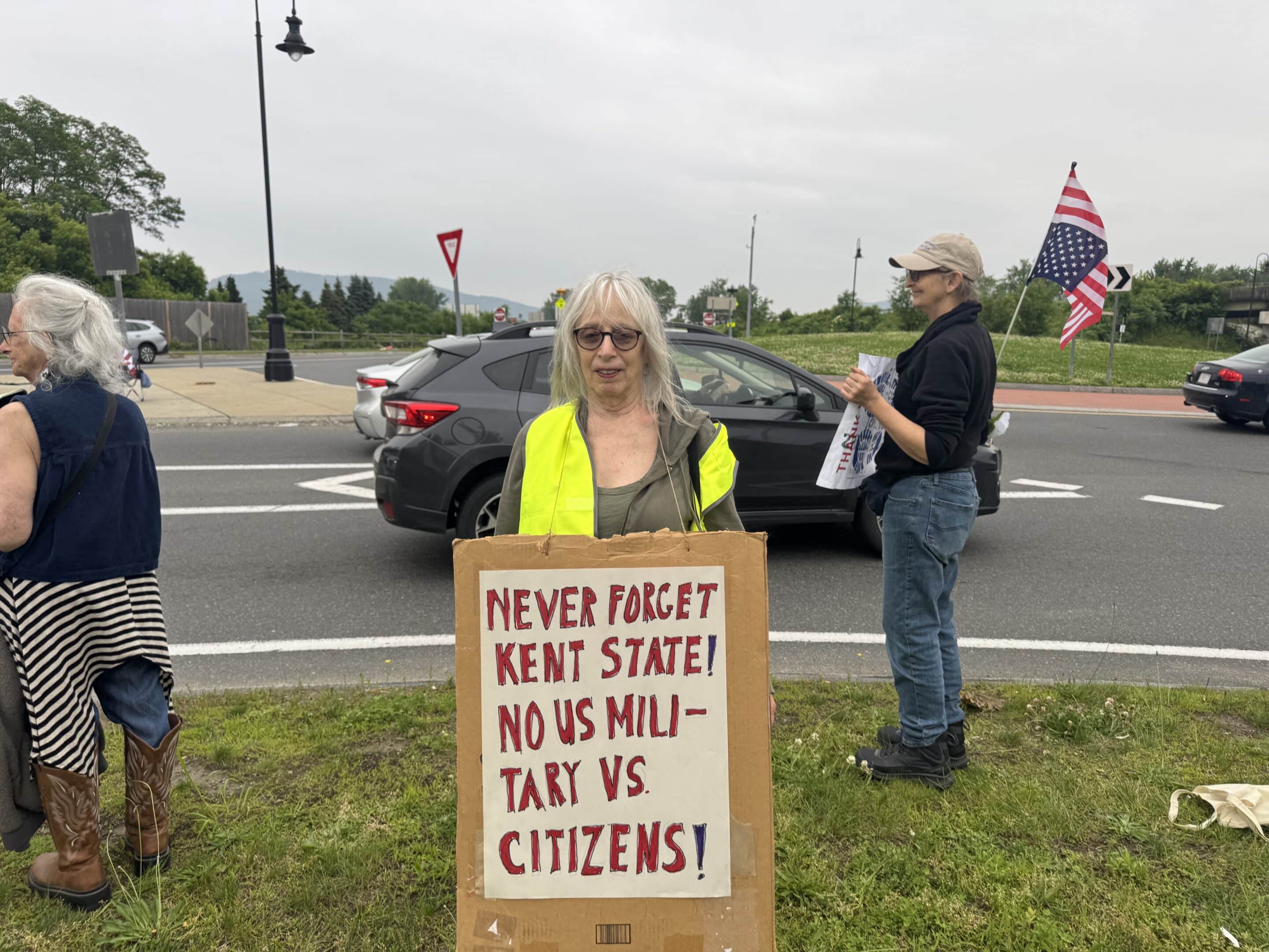 Indivisible Northampton member Ellen Schwartz at the Northampton Rotary on June 9 protesting in response to the National Guard and ICE activity ongoing in Los Angeles. Schwartz added she was immediately reminded of Kent State once she saw the news.