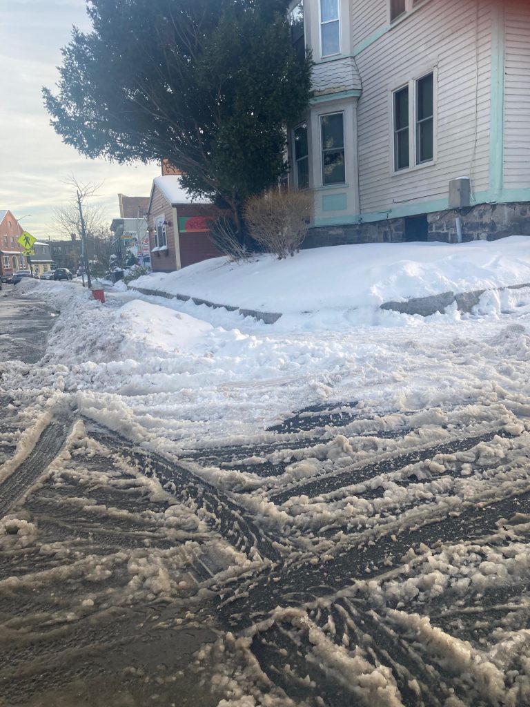A photo taken by Councilor Jeremy Dubs from his apartment of the crosswalk in front of Hampton Court the morning after last week’s snowstorm. The sidewalks were cleared but not the curbs.