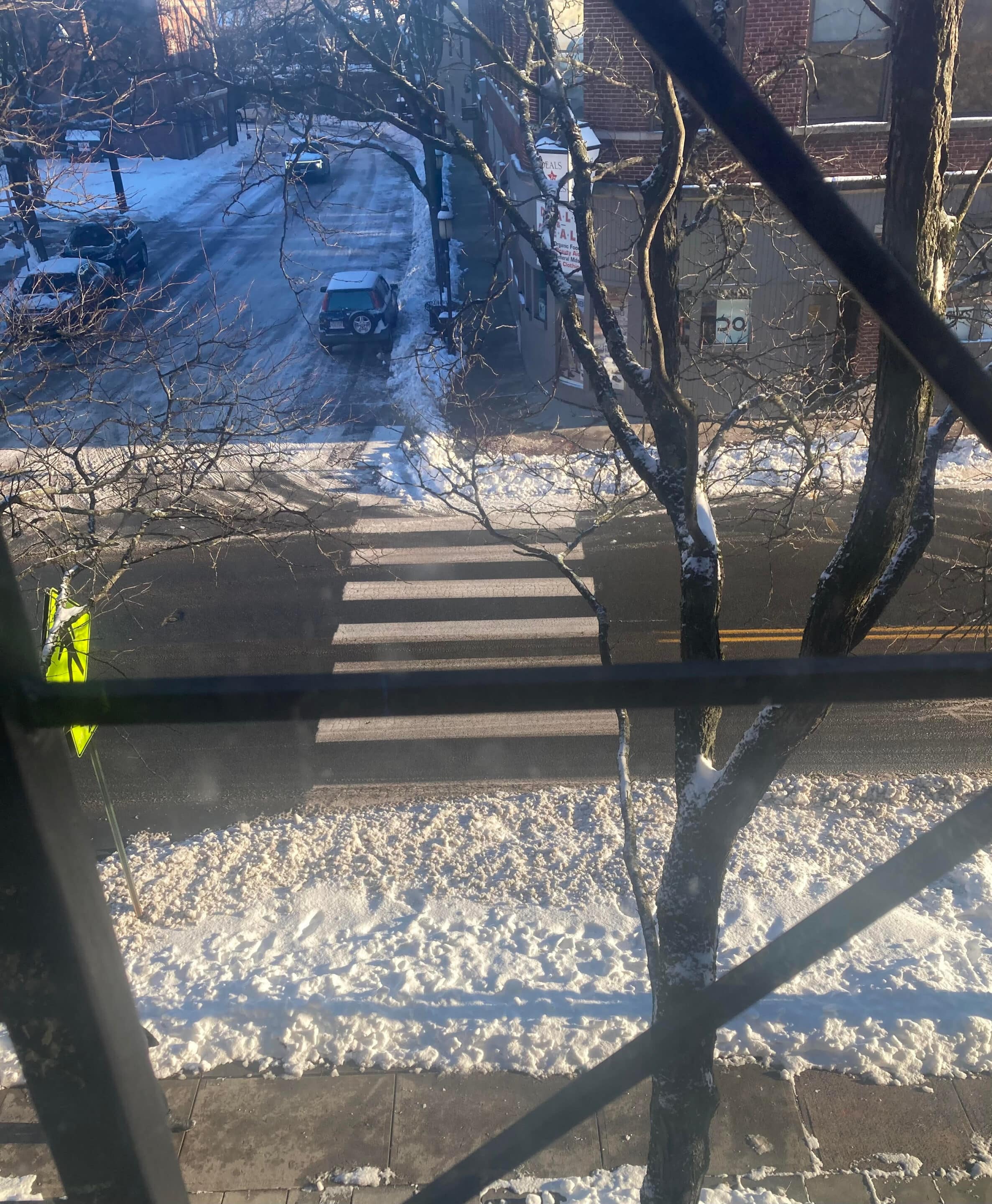 A photo taken by Councilor Jeremy Dubs from his apartment of the crosswalk in front of Hampton Court the morning after last week’s snowstorm. The sidewalks were cleared but not the curbs.
