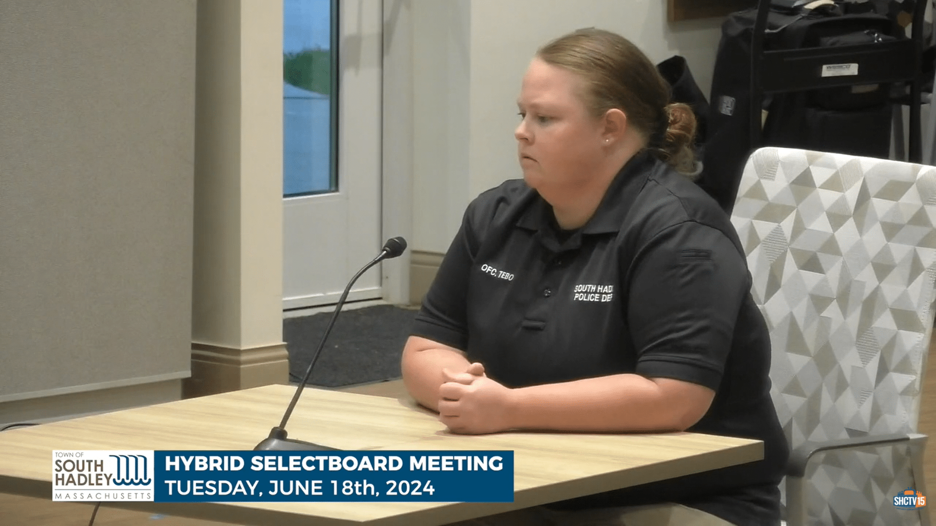 Officer Emily Tebo discusses the potential comfort dog program during the June 18 Select Board meeting.
