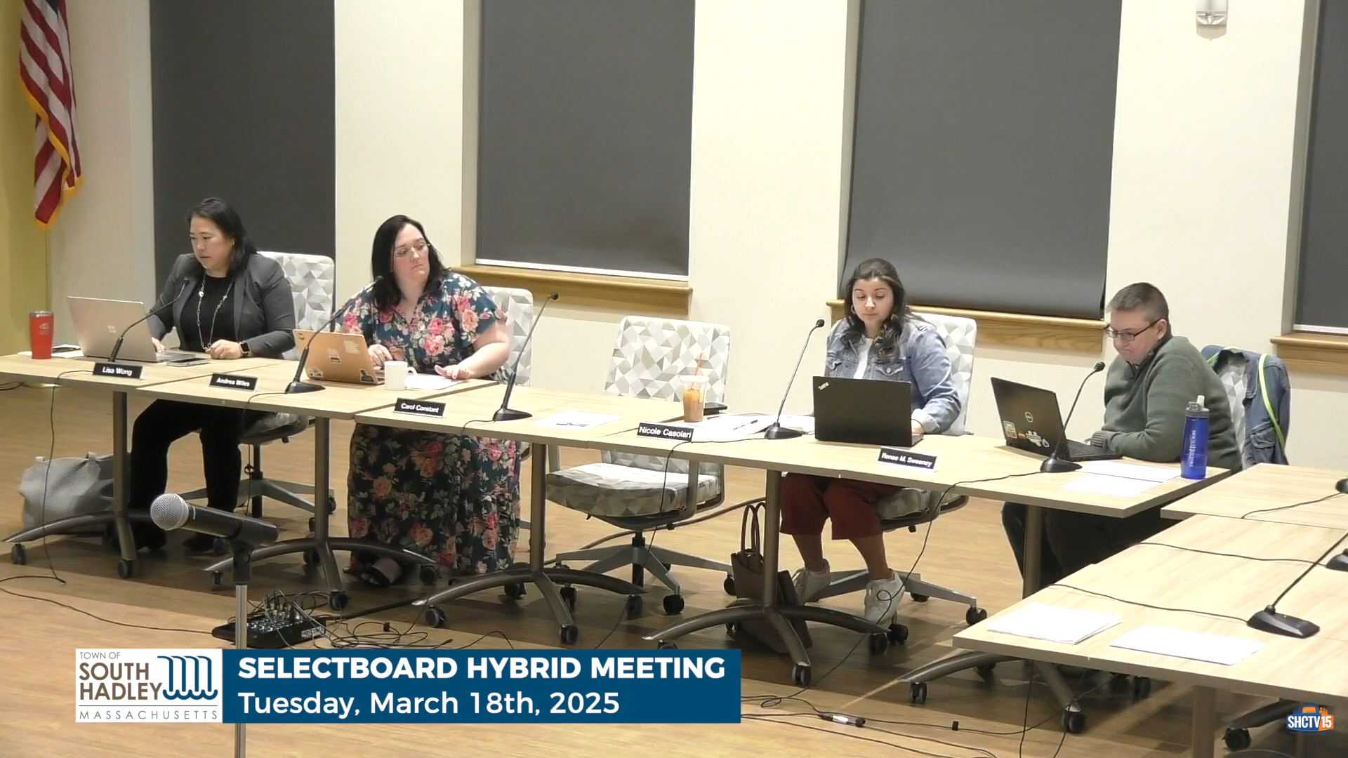 Town Administrator Lisa Wong (left) and the Select Board discuss the proposed FY26 town budget.