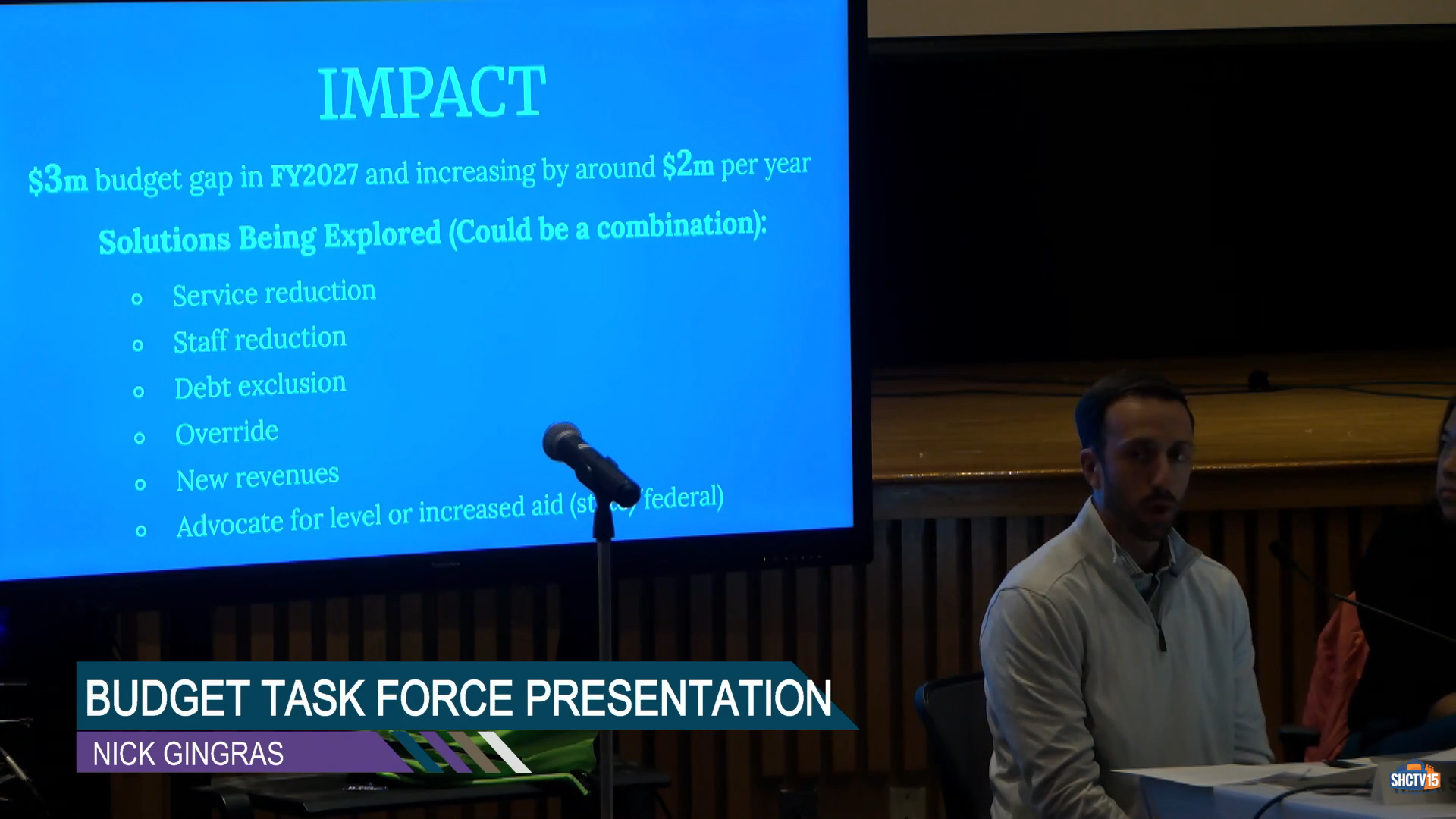 Budget Task Force Co-Chair Nicholas Gingras gave a presentation to the residents at Special Town Meeting on Nov. 5 and stated that projections saw that there will be a $3 million budget gap in fiscal year 2027, which will increase by about $2 million per year.