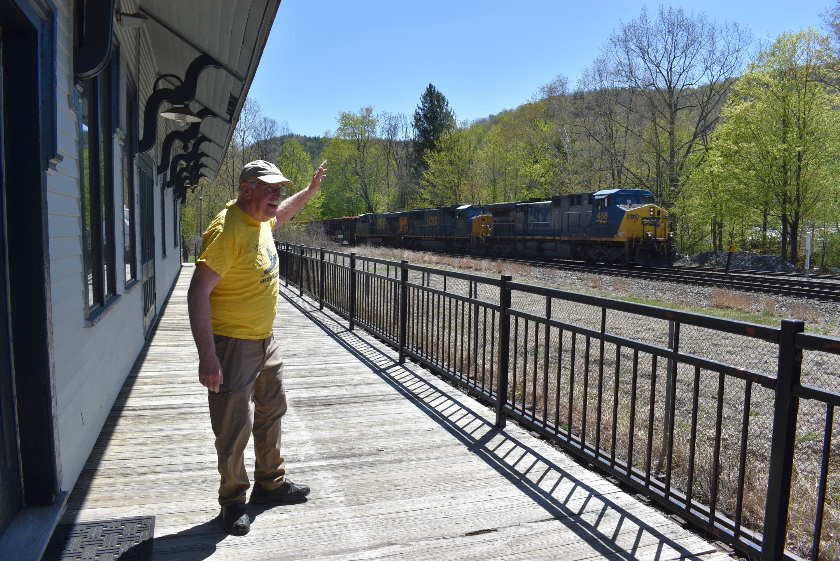 Chester Foundation President David Pierce waves to a CSX train going by the Chester Railway Station Museum, a National Historic Landmark and one of the venues for Chester on Track May 17.