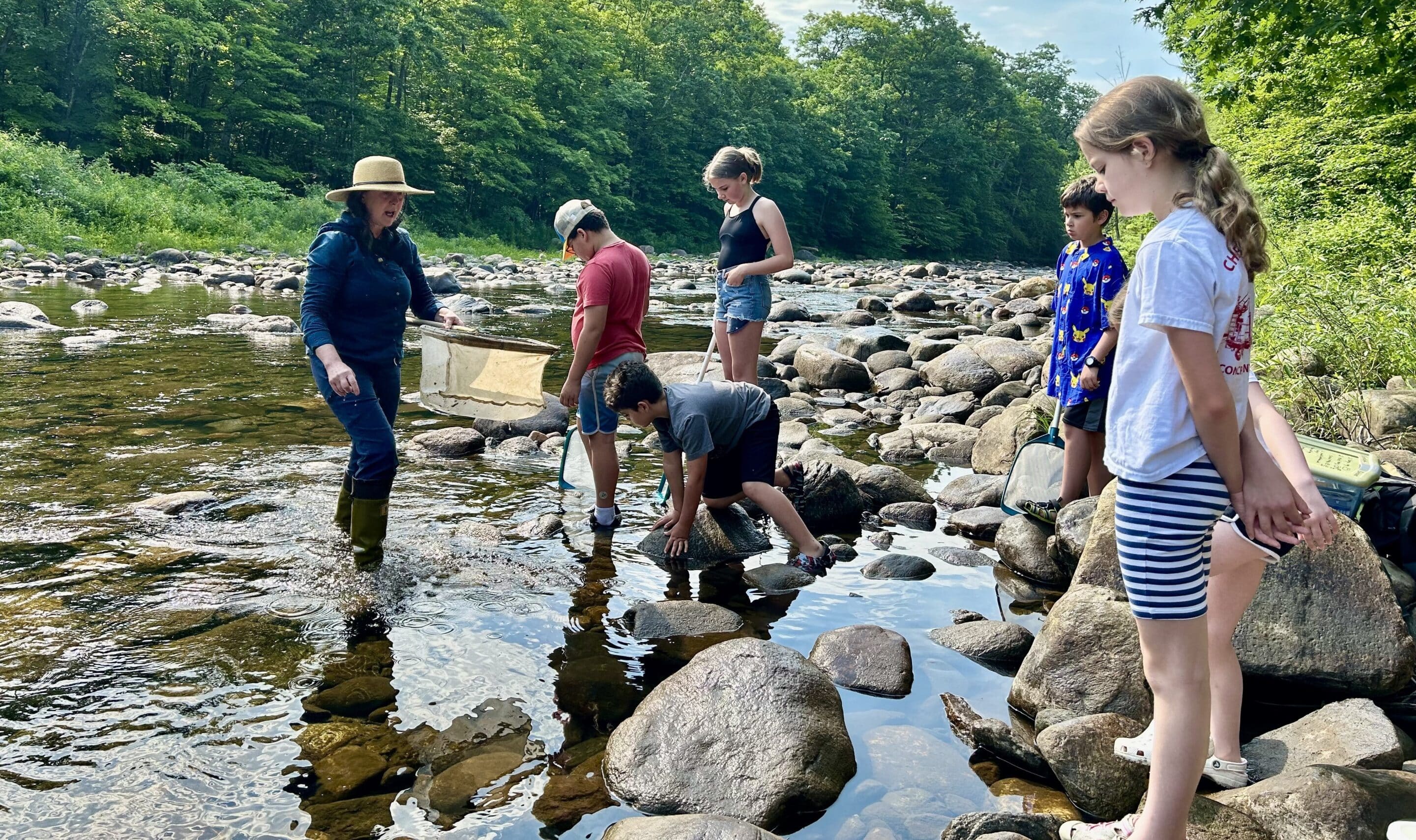 Chester Elementary students explore the Westfield River behind their school with Meredyth Babcock of the Wild and Scenic Westfield River Committee.