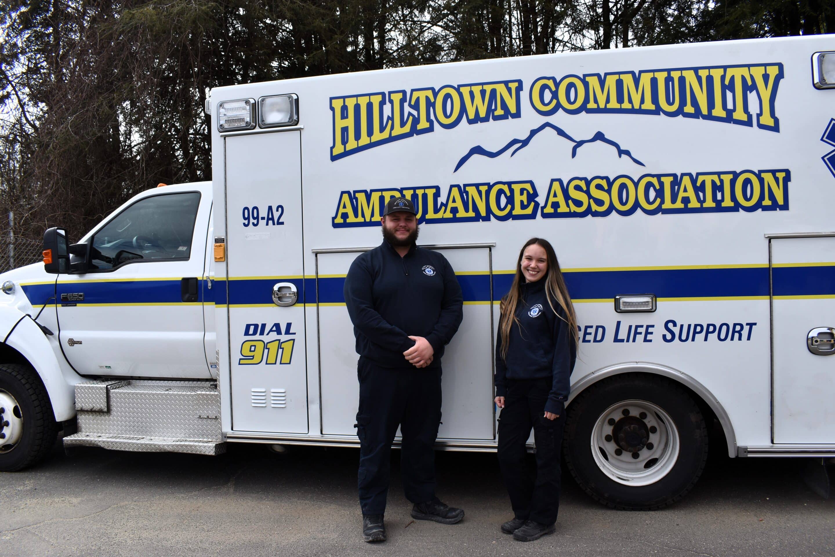 Bailey Jones, service director, and Jade Rice, chief financial officer in front of Hilltown Community Ambulance’s newest ambulance, a 2011 Ford 650 purchased last year for $75,000.