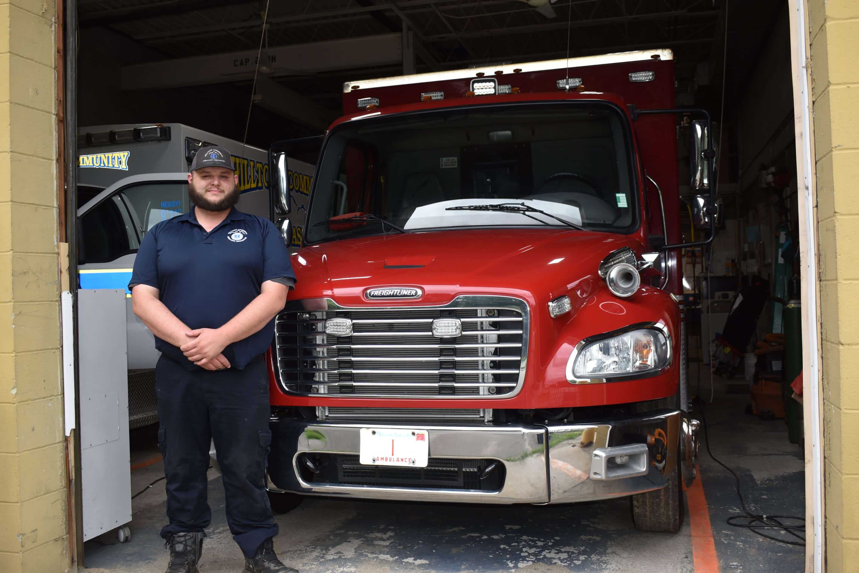 Hilltown Community Ambulance Service Director Bailey Jones in front of the 2017 Freightliner M2 ambulance purchased this month for $56,000.