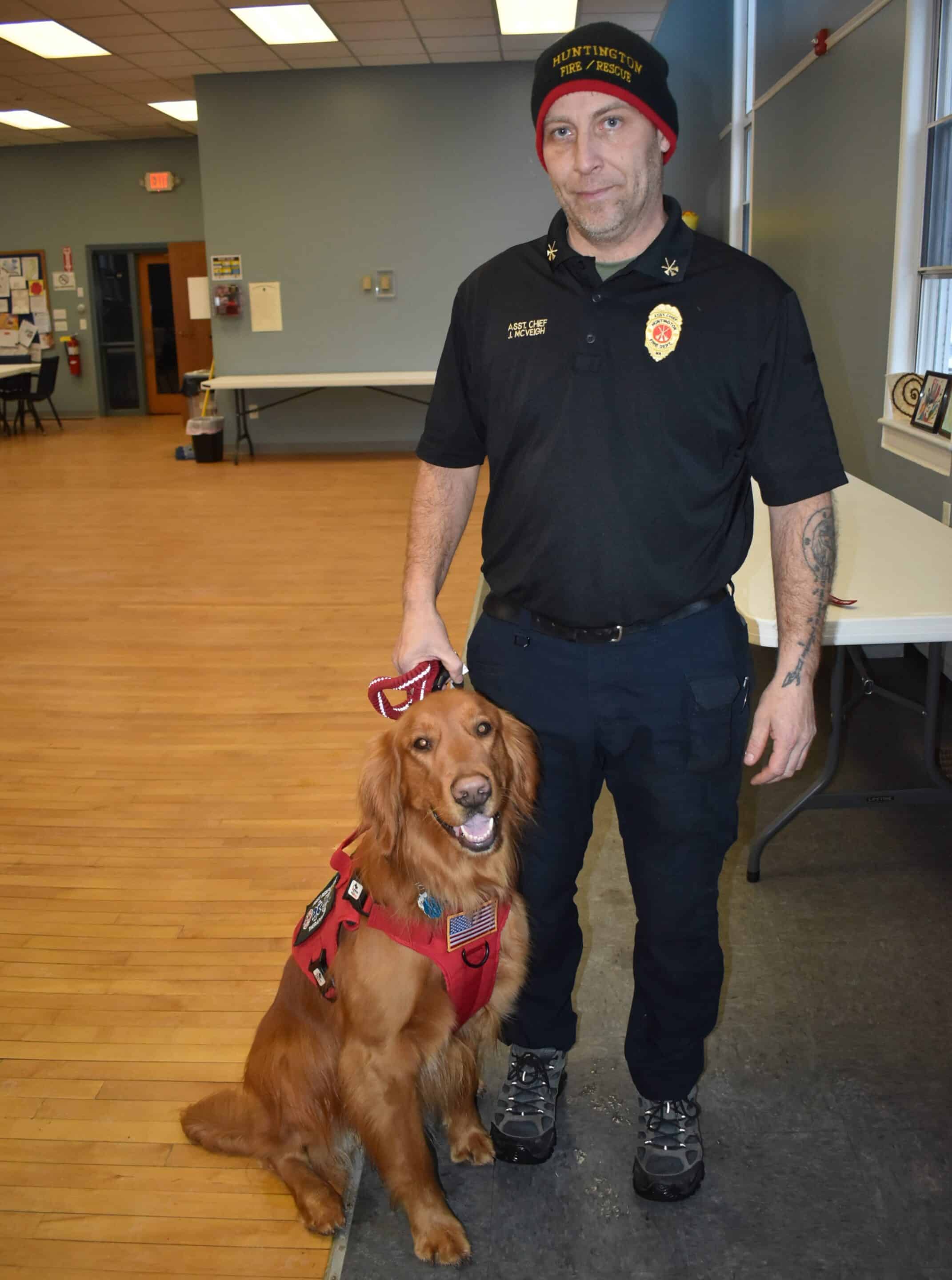 Huntington Fire Department Assistant Fire Chief John McVeigh with “Duke,” the department’s first responder therapy dog.