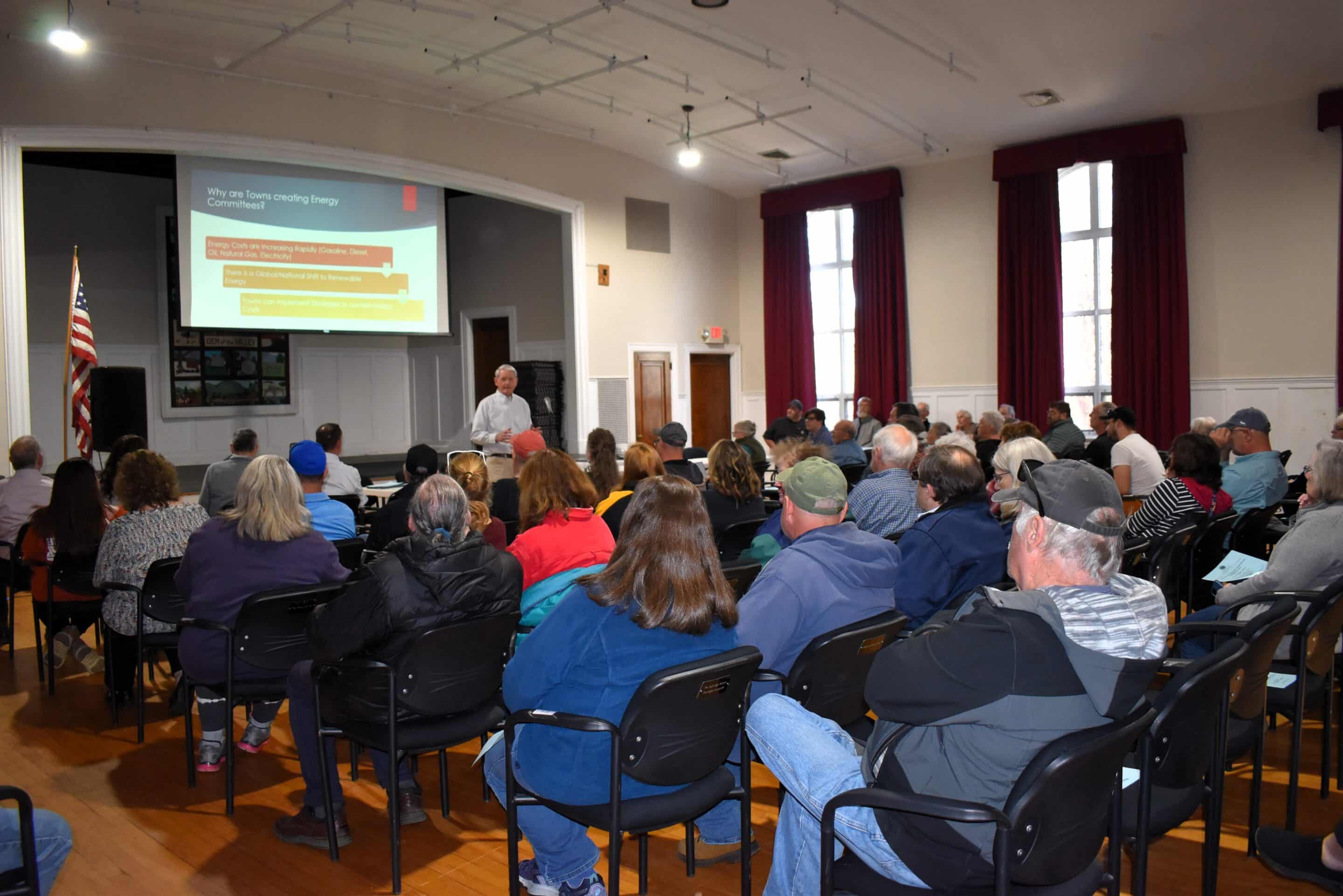 The April 22 session began with an introduction by Andy Myers, chair of the town’s Energy Committee, formed by a Town Meeting vote in June 2023 to look at the rising costs of energy and ways that the town could shift to renewable energy.