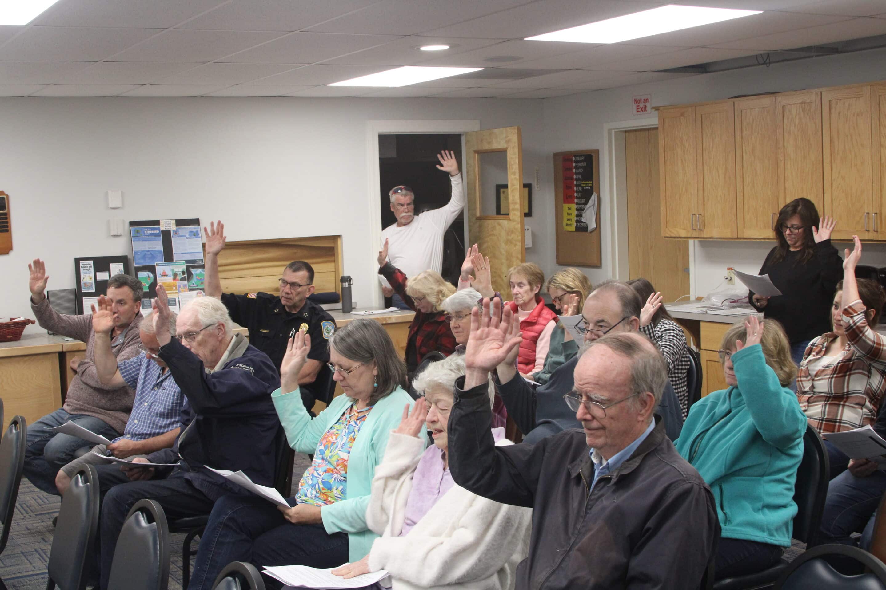 Voters at Tolland’s Town Meeting raise their hands in favor of an article. Most articles passed unanimously, with little discussion.