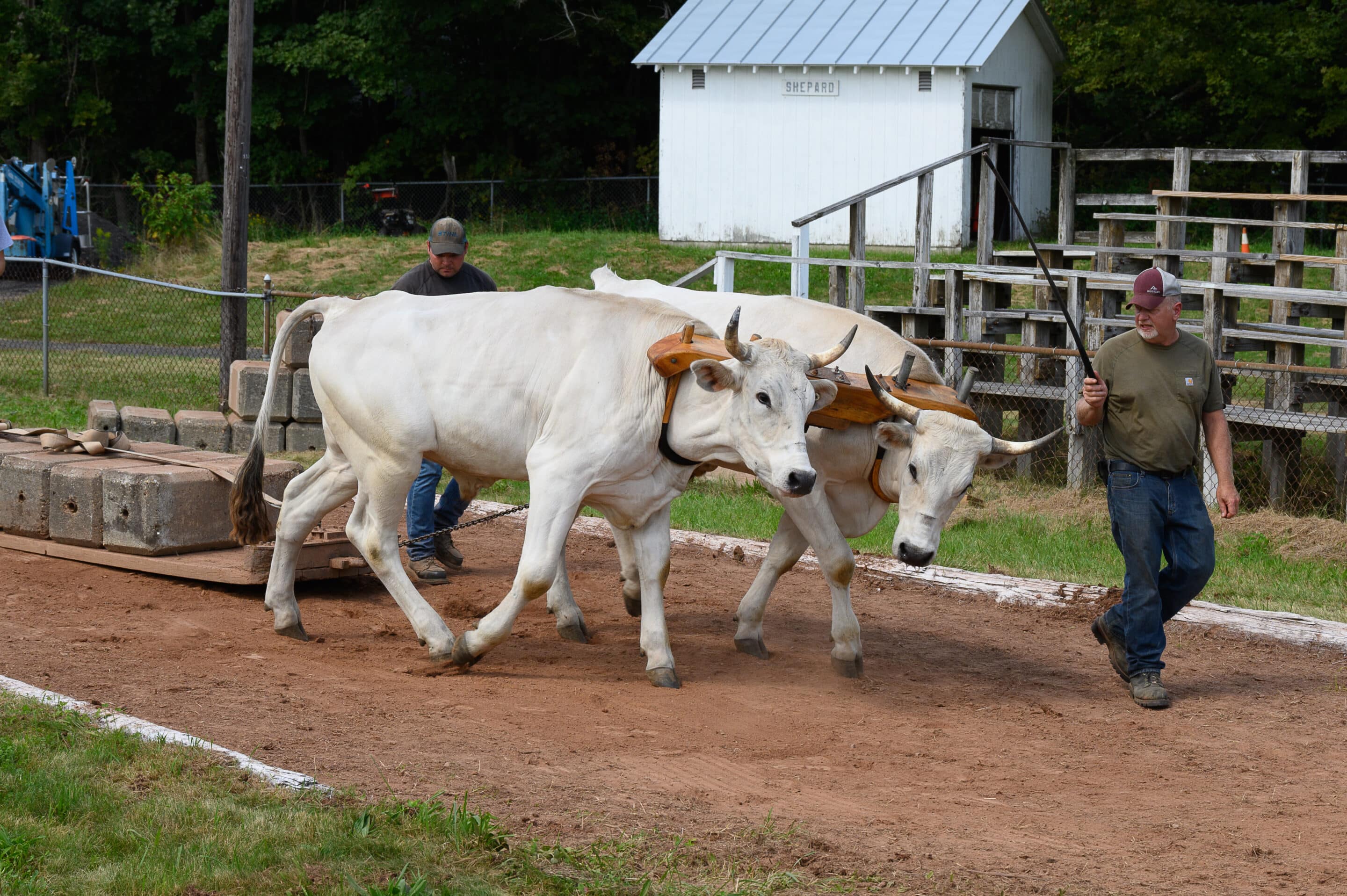 Dale Sherman, of Worthington, leads Spring and Fall during the Sept. 1 oxen draw at the Blandford Fair.