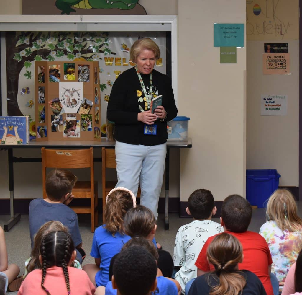 Sullivan then read to the students a book, “The Rescuer of Tiny Creatures,” by Curtis Manley, about a girl who rescues tiny creatures like worms and bugs, with the help of her little brother.