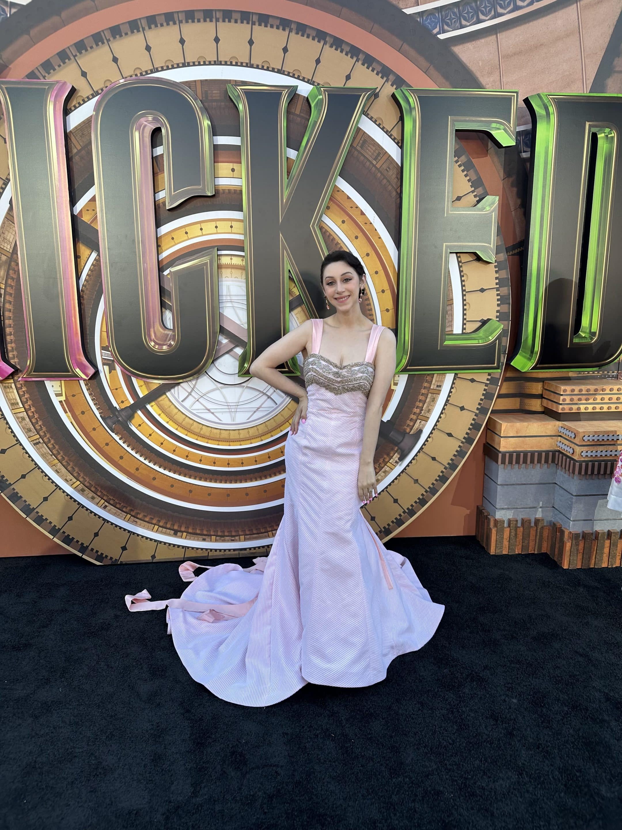 Tori Calamito shows her dress designed by Paper City Fabrics owner Joseph Charles at the “Wicked” movie premiere in Los Angeles.