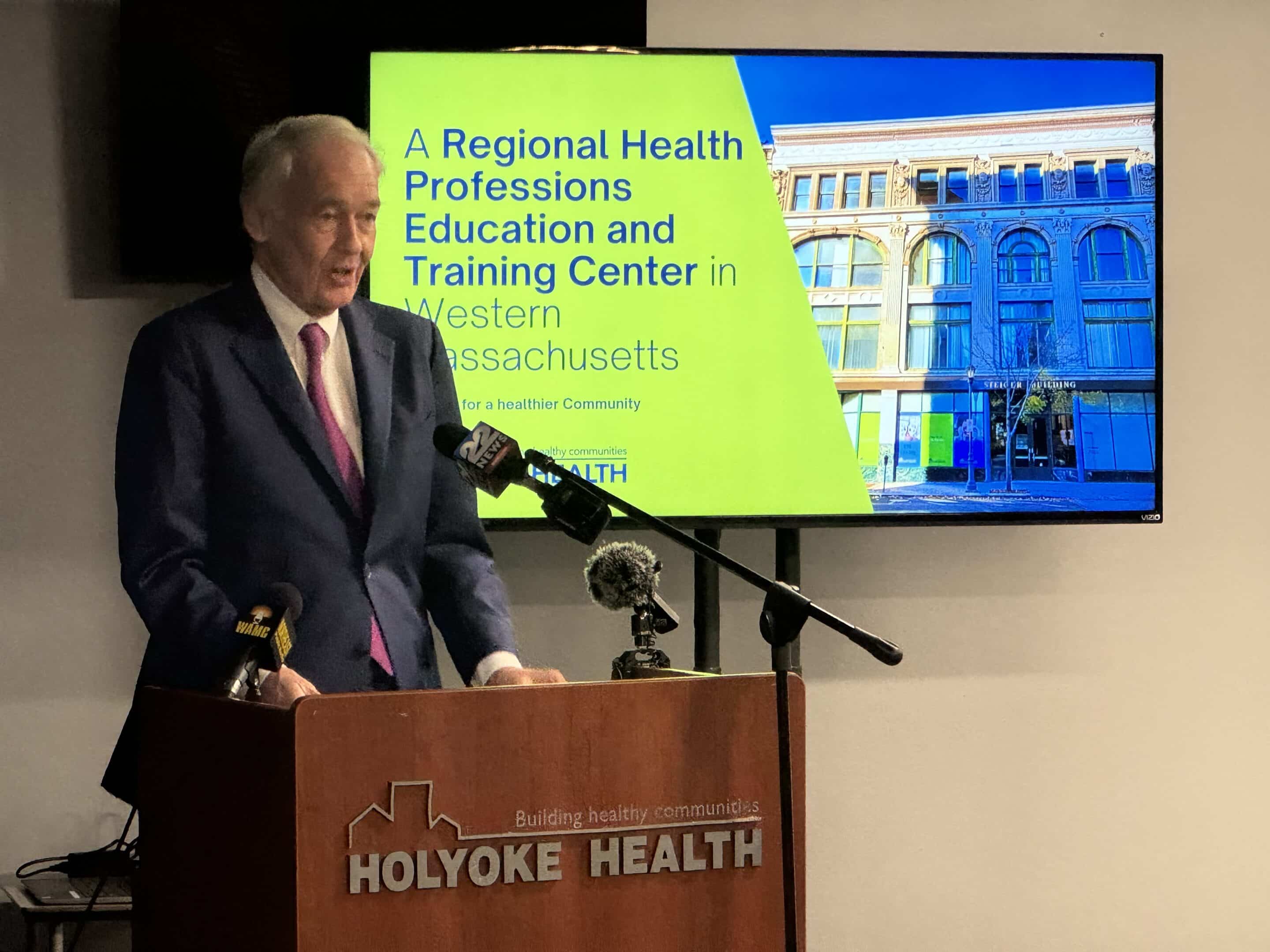 Joined by Holyoke Health Center President Dr. Alejandro Esparaza-Perez, HCC President George Timmons and state Sen. John Velis (D-Westfield), Markey spoke about the importance of this crucial funding to help jumpstart careers in a healthcare field feeling the impact of a worker shortage.