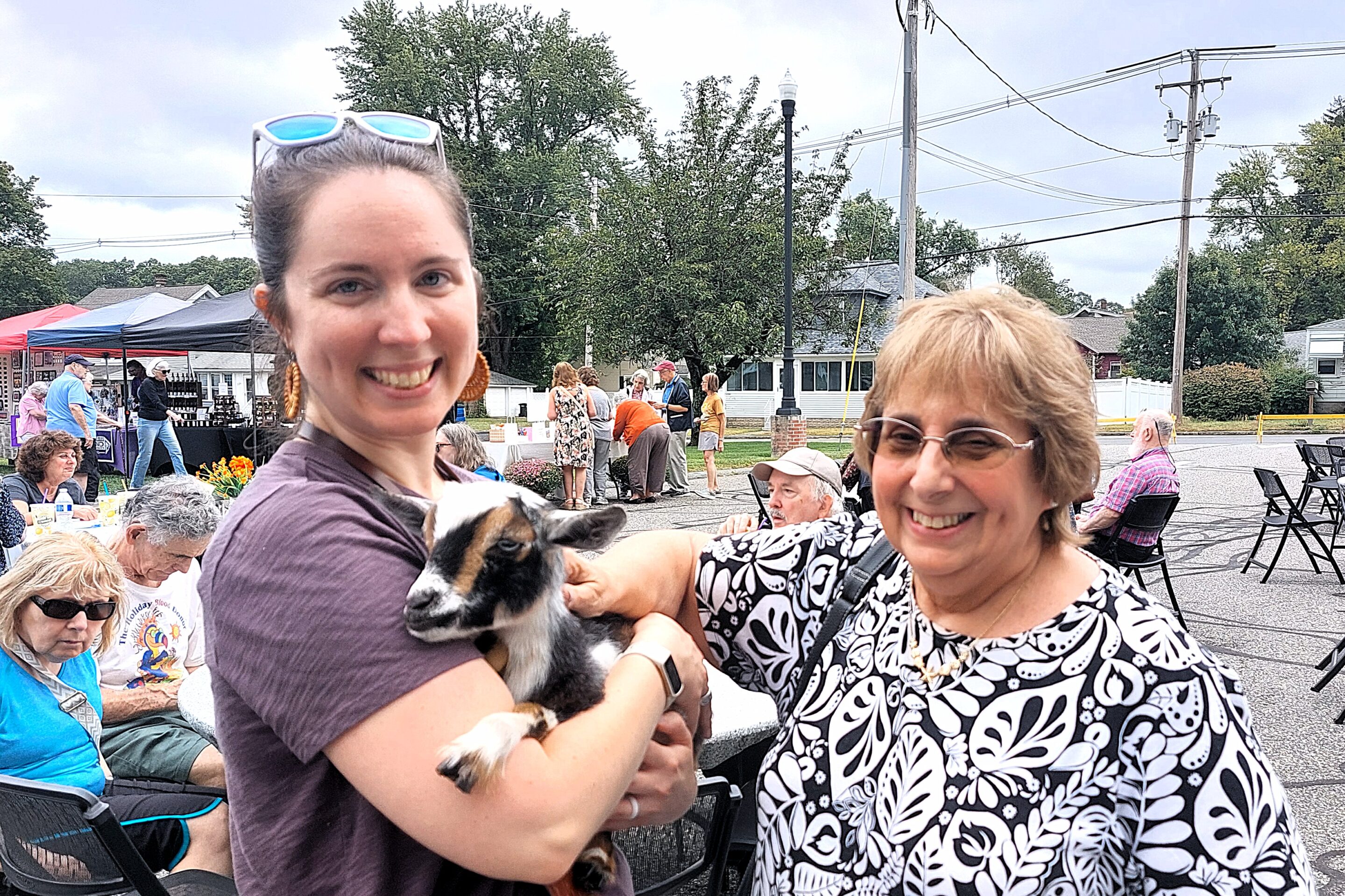 Alicia Mattsson-Bozé and Joy Letendre snuggle with Moosetracks, a baby goat from Cloverbrook Farm.