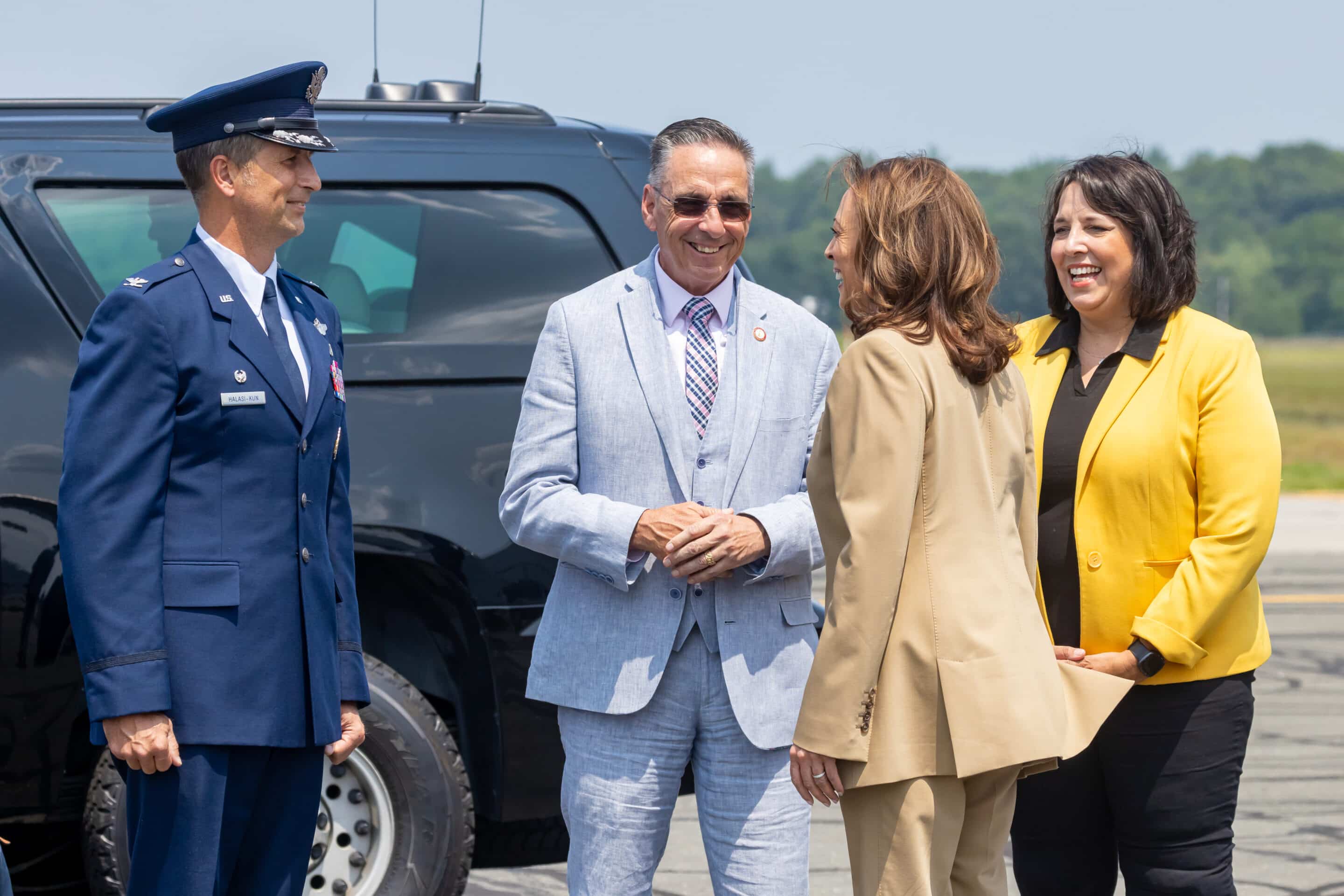 Jeffrey Gunther, chair of the Westfield Democratic Committee, also took part in the event. He said Harris spent some time with a group of supporters gathered in the designated area to greet her after meeting with the mayor and others on the tarmac.