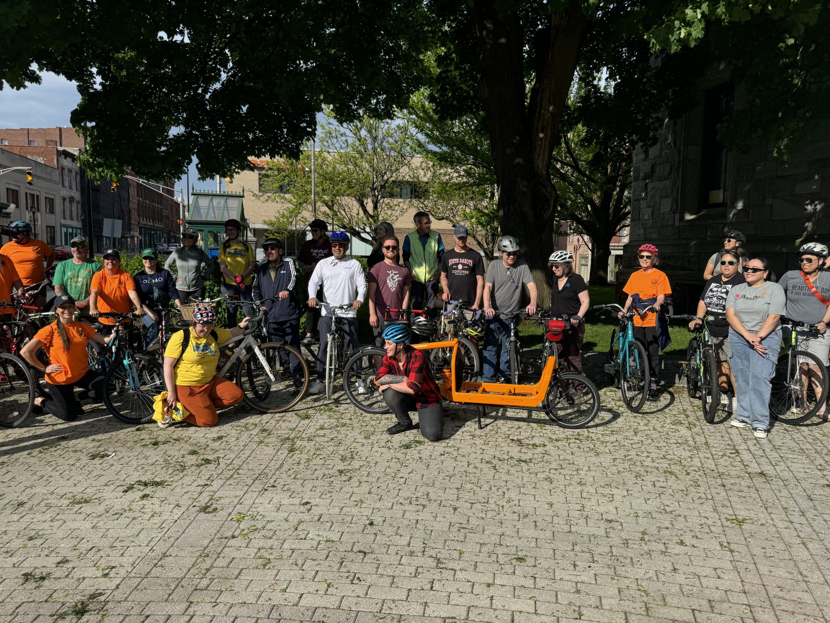 Holyoke Mayor Joshua Garcia poses with residents at City Hall before leading the bike ride around the city.