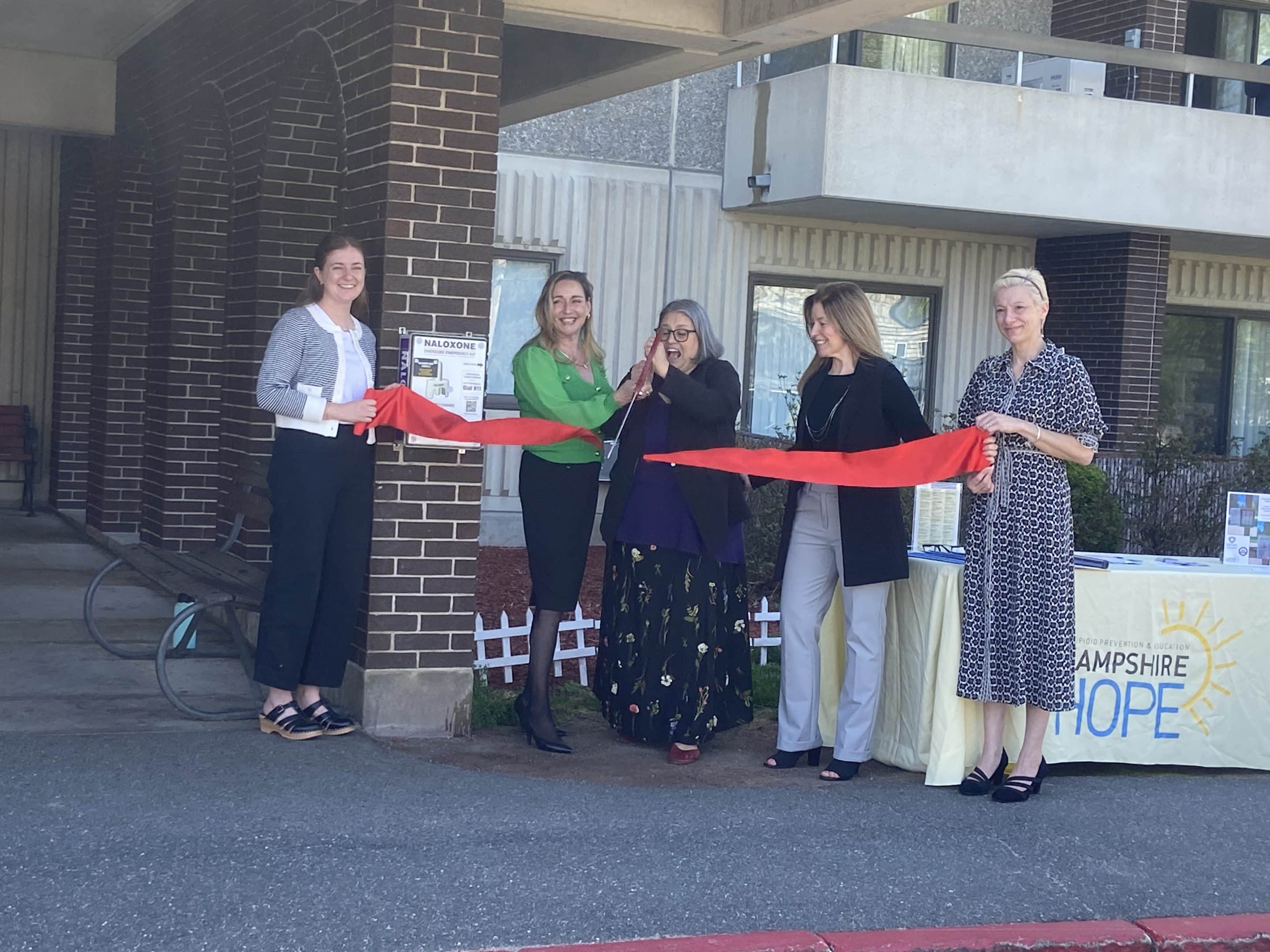 Northampton Housing Authority Executive Director Cara Leiper (second from left), Mayor Gina-Louise Sciarra (middle) and Department of Health and Human Services Director Merridith O’Leary (second from right) cut the ribbon in celebration of more naloxboxes available in the city.