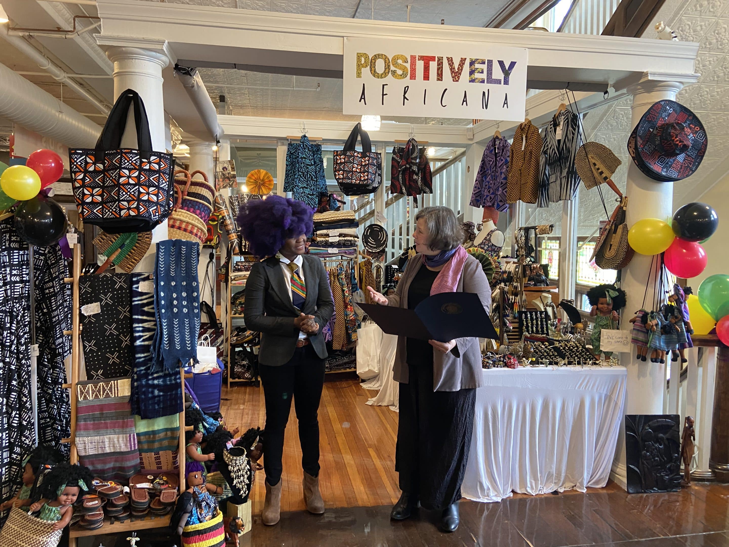 Positively Africana founder and owner Aimee Salmon (left) was awarded a senate citation by state Sen. Jo Comerford (right) after being recognized as this year’s Black Excellence on the Hill Award recipient for the Hampshire, Franklin Worcester districts.
