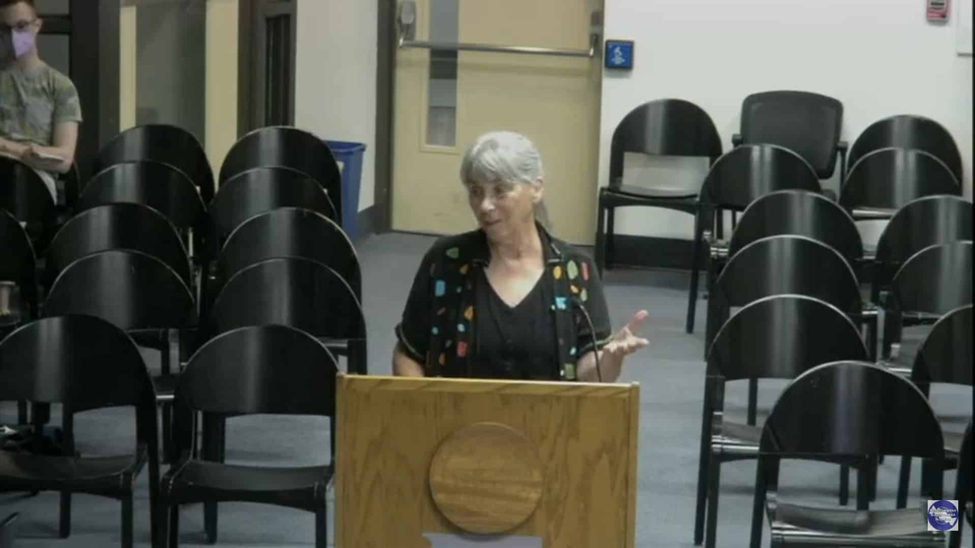 Former School Committee member Meg Robbins talks about the state aid resolution in front of the City Council on Sept. 19.