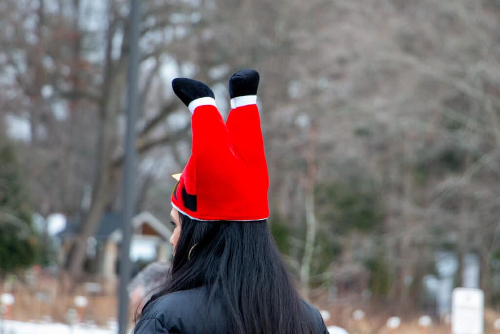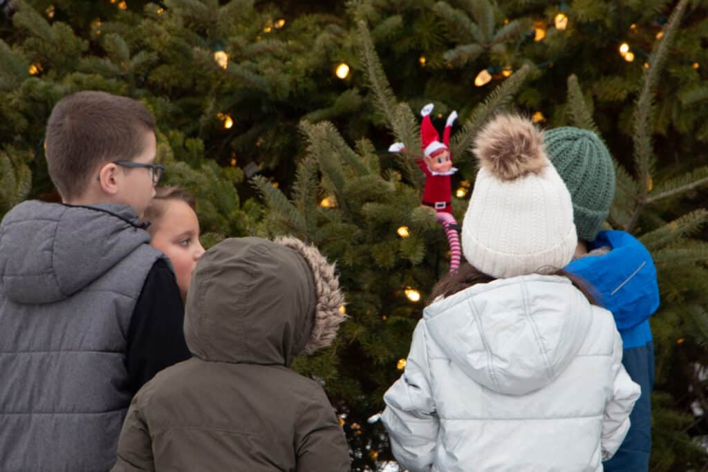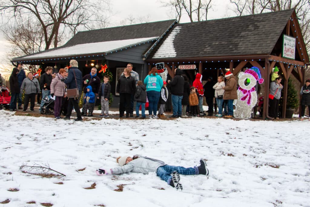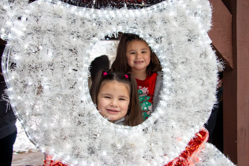 Top row, from left: A little girl makes snow angels as she waits for Santa Claus to arrive. Children gather around an Elf found on the Christmas Tree awaiting Santa Claus. Family and friends anticipate Santa Claus’ arrival at the Mittineauge Park. Middle row, from left: Santa Claus’ legs found in hat form. Sisters (front) Zoe and (back) Brooklyn Gallup pose through a snowman light up standee as they wait to meet Santa Claus. Festive decorations were placed around Santa’s House. Bottom: Santa Claus patiently awaits all the young boys and girls looking to share laughs and discuss Christmas gifts.