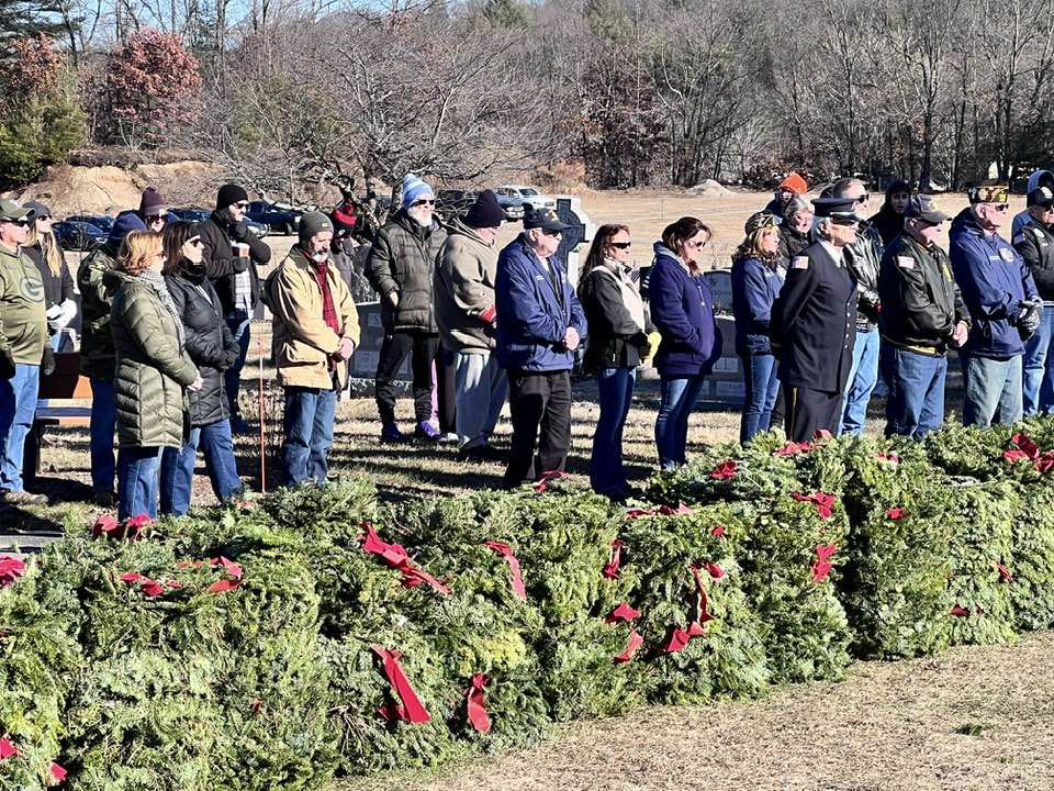 A group of family members of veterans buried in Southwick’s two cemeteries and volunteers stand in silence to remember the fallen before fanning out and placing the evergreen wreaths on the veteran’s graves on Dec. 14 during the Wreaths Across America event.