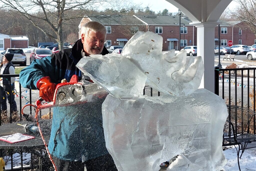 Senior Center patrons ate lunch while listening to live holiday music sung by The Fort Carolers from the Student Prince Cafe and The Fort. During the event, people watched ice sculptor and artist David Barclay create a reindeer sculpture from two 300-pound blocks of ice.