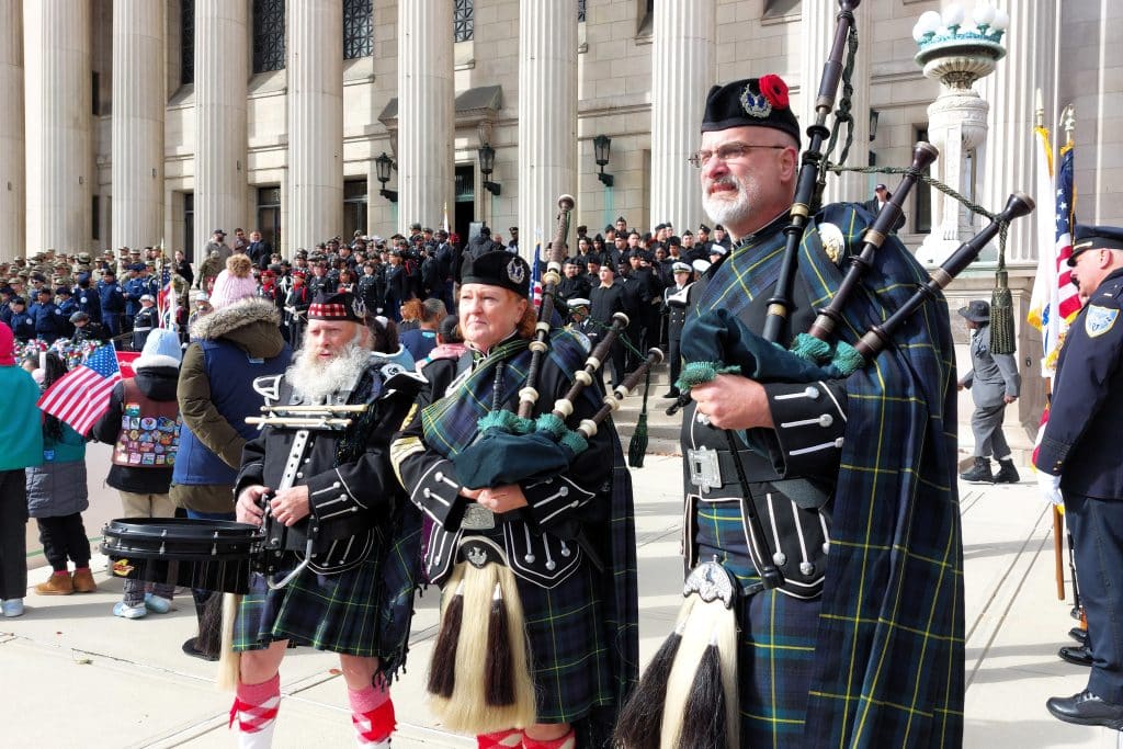 The Springfield Kiltie Band, Edward Cook, Tina Harkness and Dave Kern prepare to play during the handing of the wreaths.