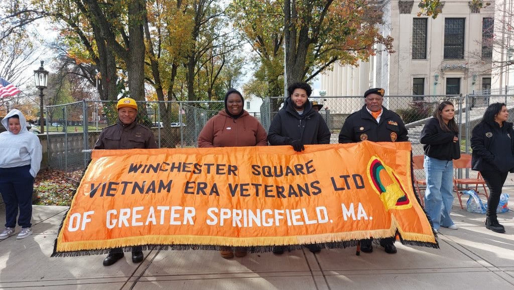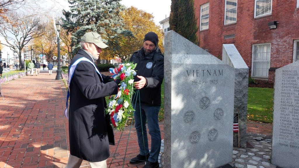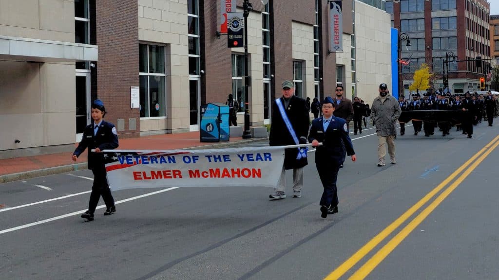 Each year, Springfield honors a “veteran of the year.” This year it was Elmer McMahon, who served in the U.S. Army in Europe during the late 1960s, before joining the Springfield Police Department. He thanked the crowd for remembering the veterans and said, “There’s a great sense of patriotism here today.” Later, he said that he hoped taking part in Veterans Day ceremonies would “galvanize the youth.”
