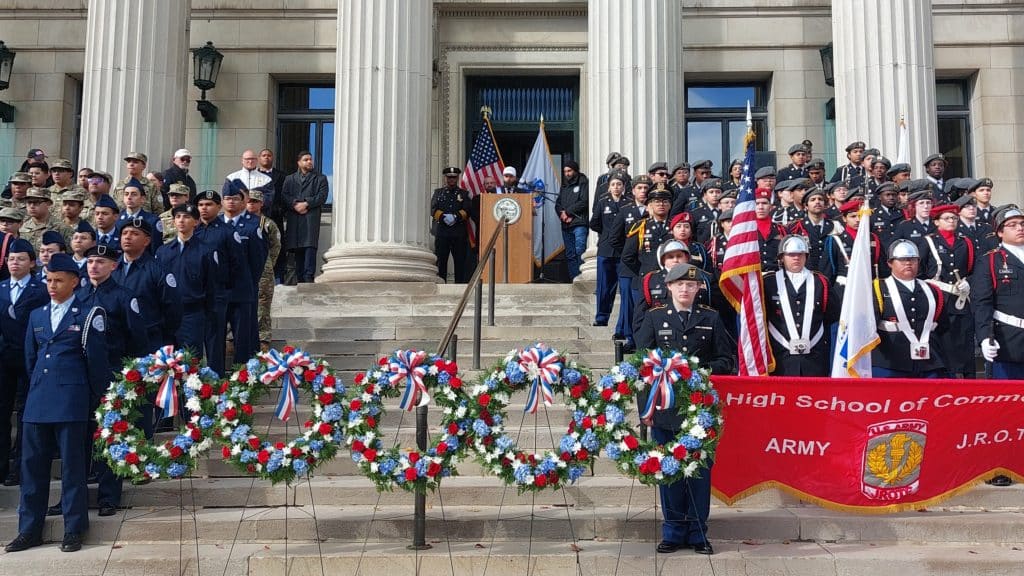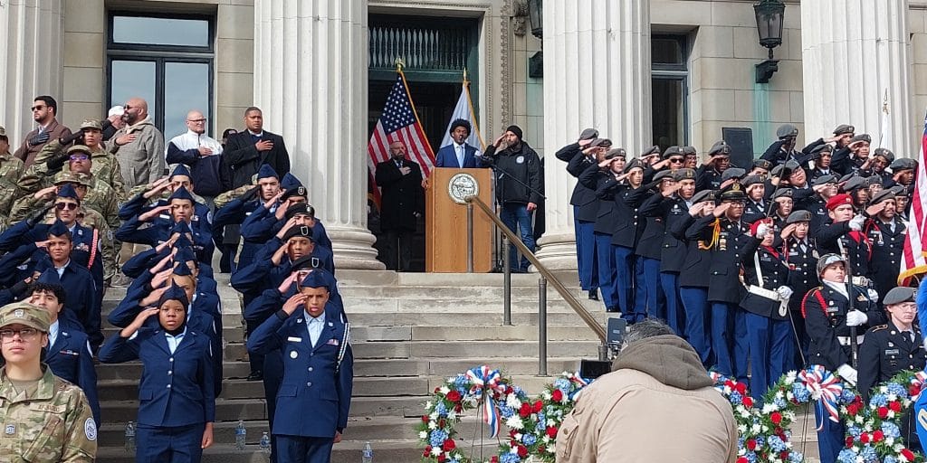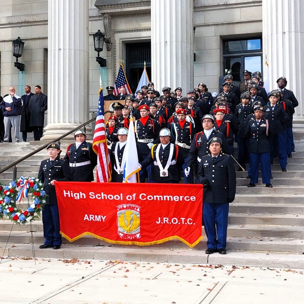 Members of Springfield High School of Commerce Army JROTC stand on the steps of City Hall, while Mayor Domenic Sarno’s Chief of Staff Bill Baker reads a proclamation.