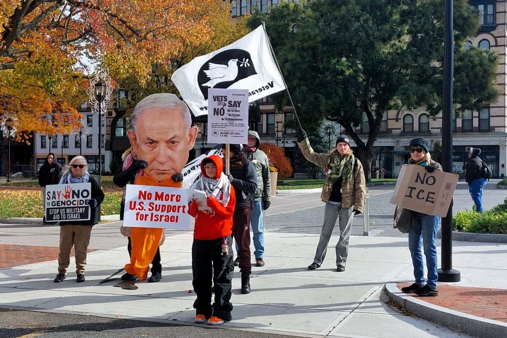Veterans for Peace hold signs across from City Hall after marching in the Veterans Day Parade.