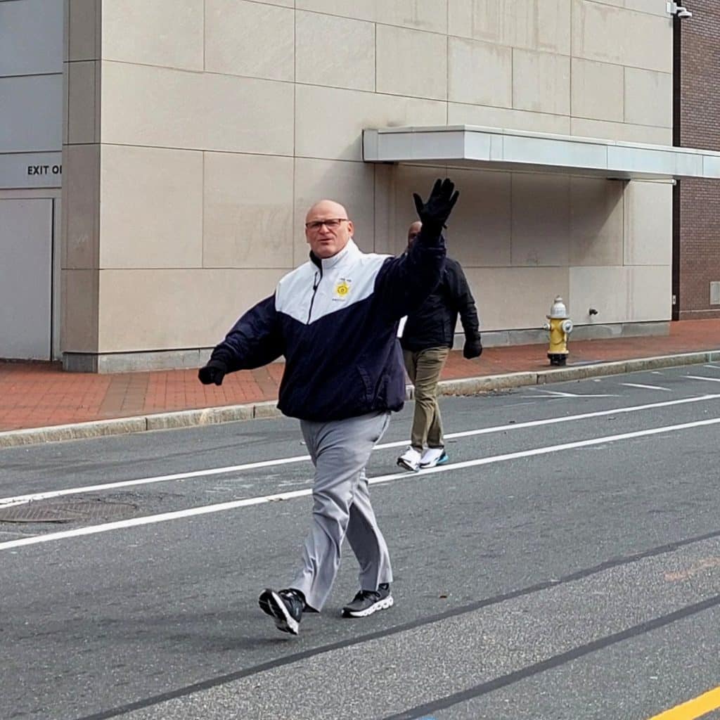 Hampden County Sheriff Nock Cocchi waves to onlookers.