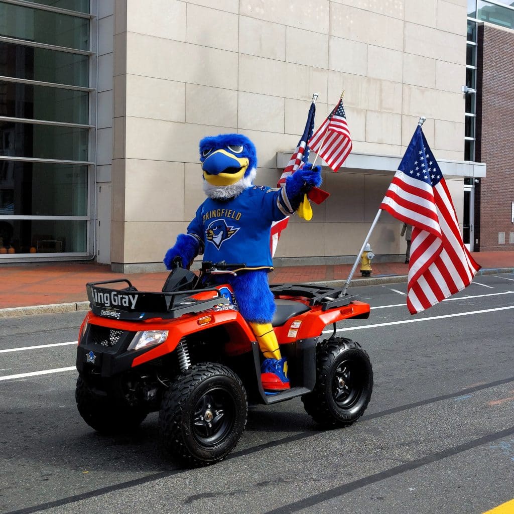 Springfield Thunderbirds mascot Boomer rides a four-wheeler, waving the American flag.