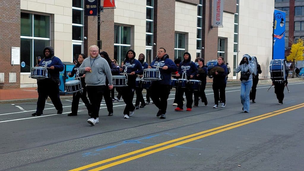 The Springfield High School of Science and Technology marching band plays for spectators
