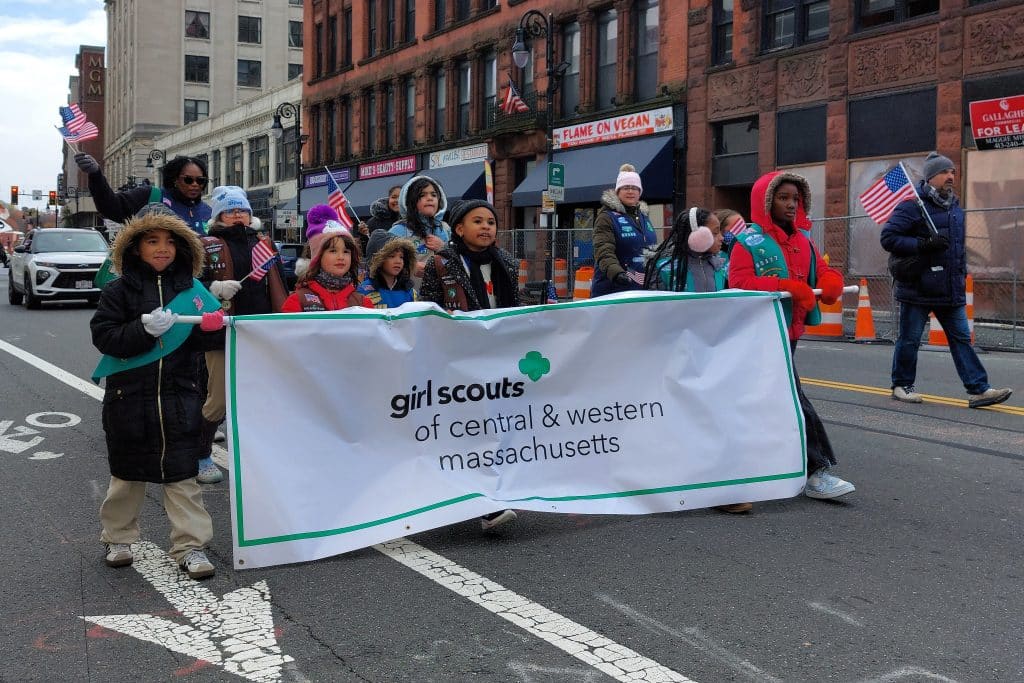 The Girl Scouts of Central & Western Massachusetts march behind their banner.