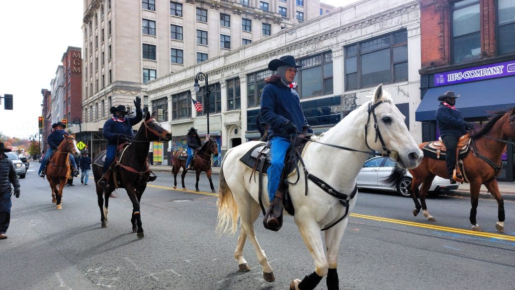 People ride horses along the parade route.