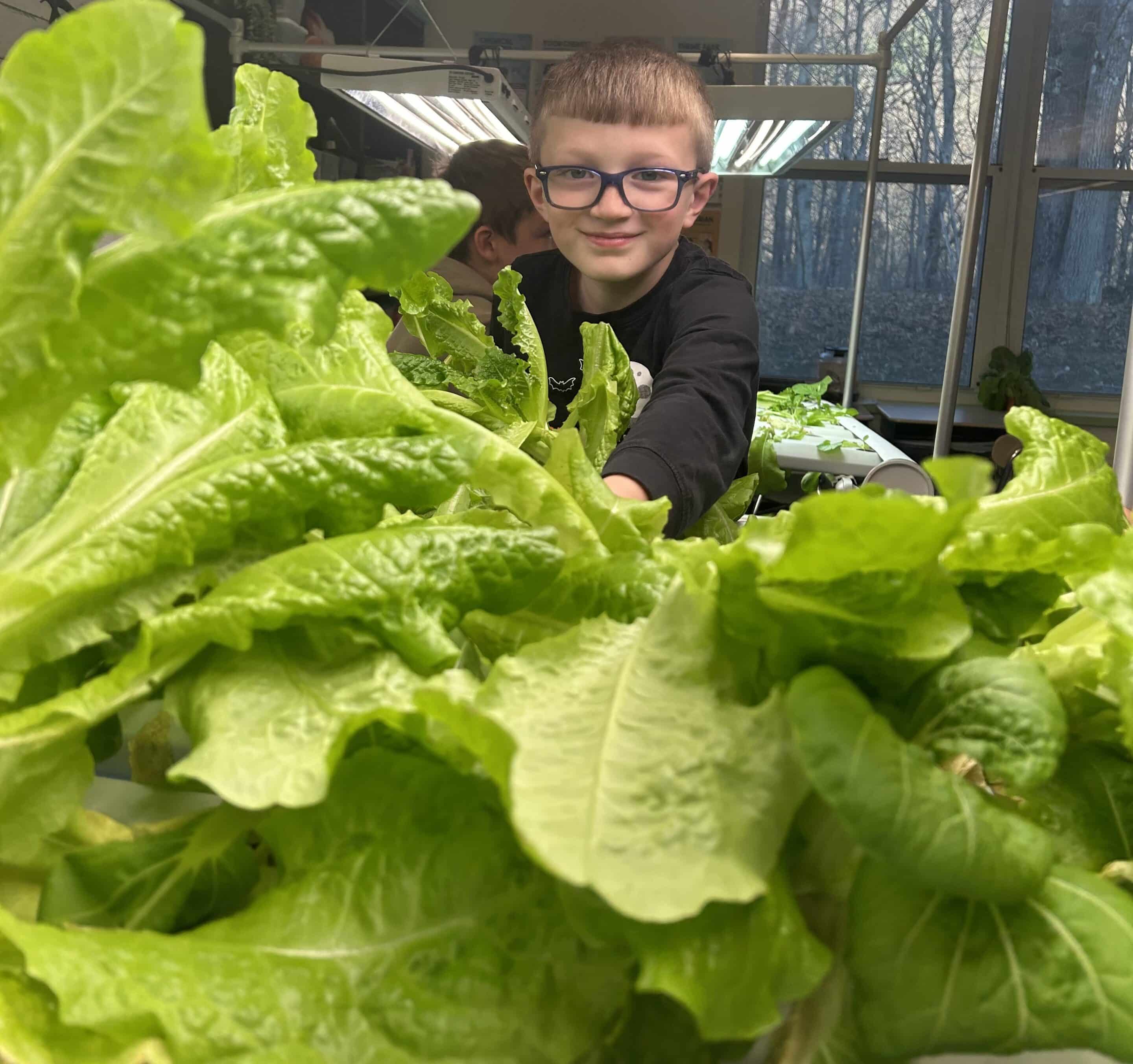 Elementary third grader Keagan Dunn with the school’s hydroponically-grown lettuce harvest.