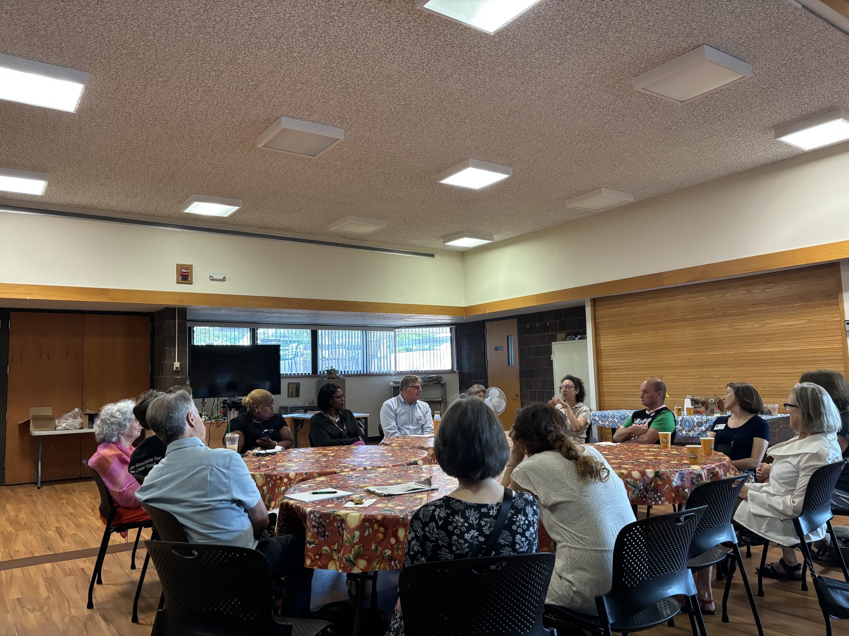 Town Manager Paul Bockelman and Superintendent Dr. Ericilda Xiomara Herman meet with community members at Cuppa Joe with Paul event.