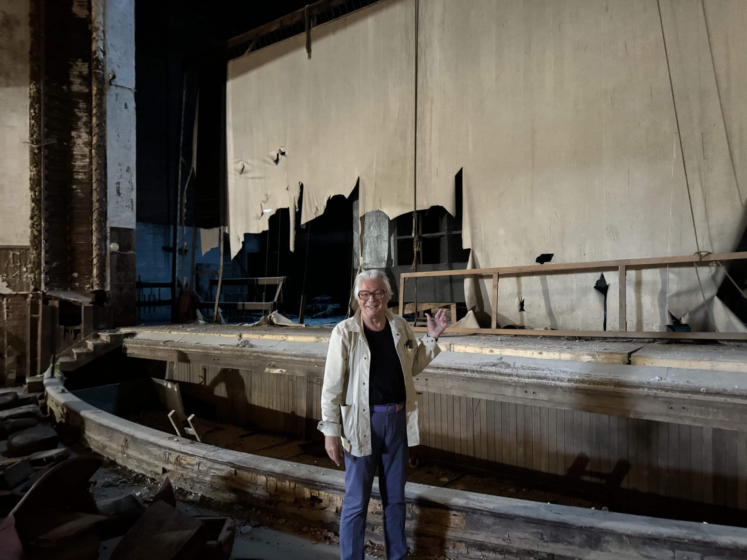 MIFA Executive Artistic Director Don Sanders stands in front of the Victory Theatre’s stage and orchestra pit amidst renovation of the space.
